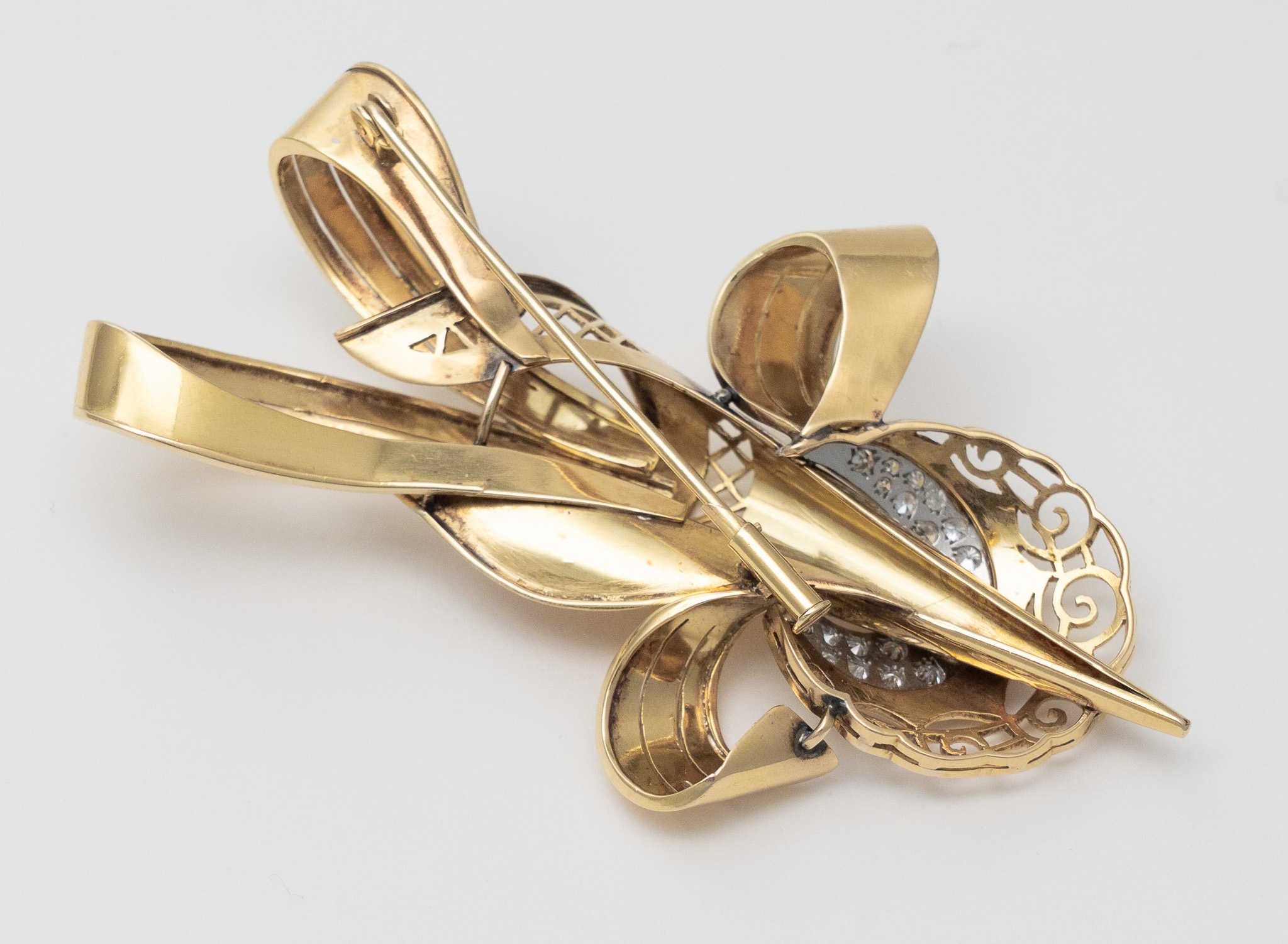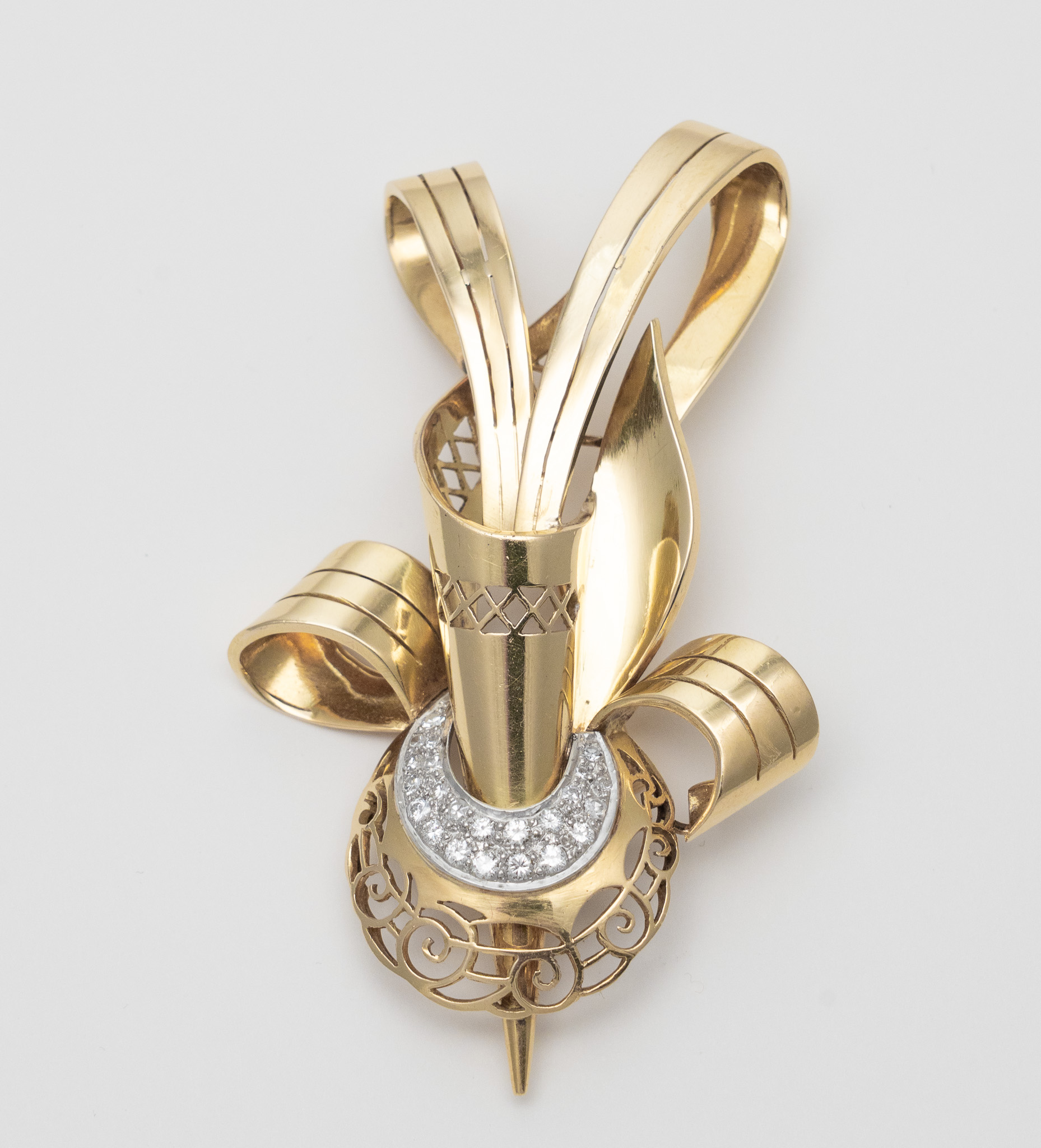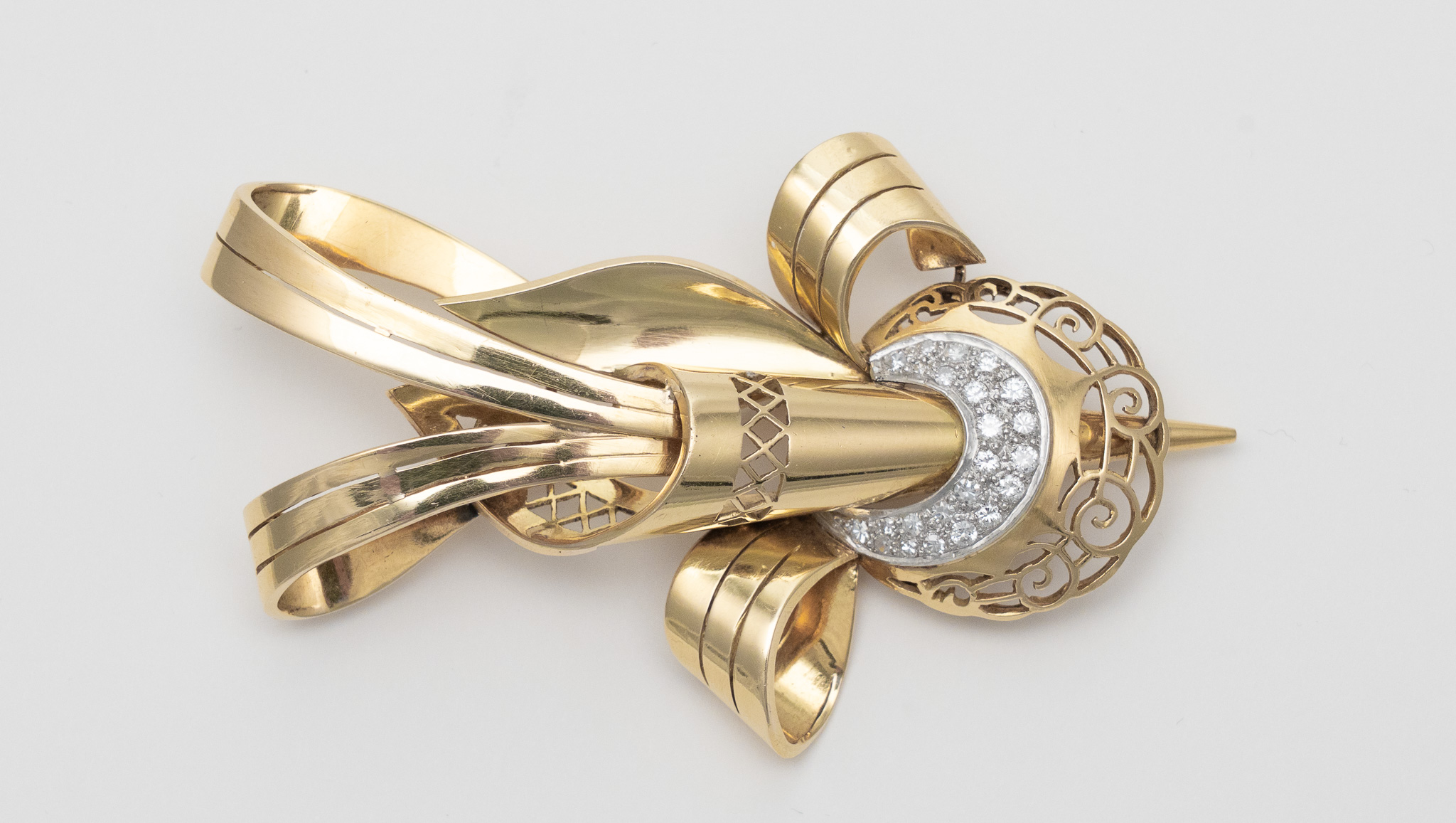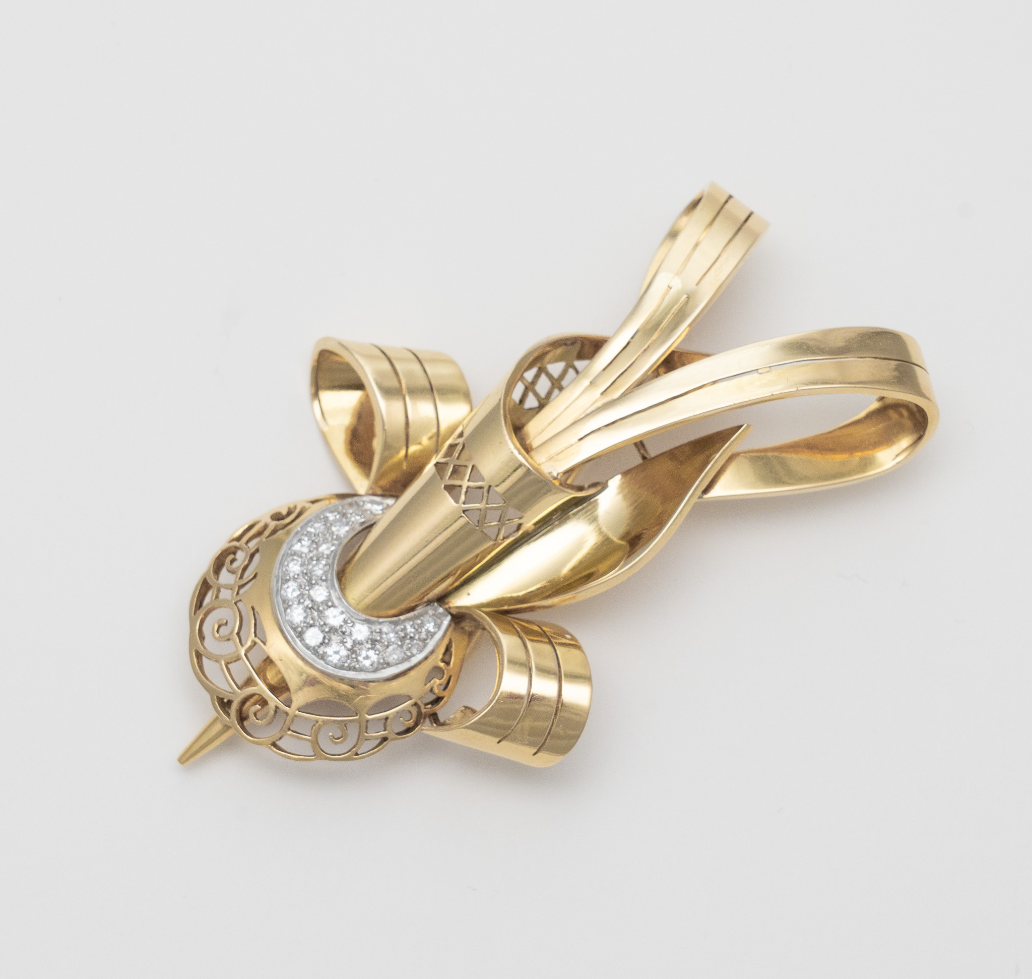 Eine solide Brosche gearbeitet in 18 Karat Gelbgold (750/1000), besetzt mit 23 Achtkant-Diamanten von zusammen ca. 1 ct.(Wesselton/VS). Das Design ist im Stil der 1940er- bis 1950er-Jahre gehalten und zeigt ein kunstvoll geschwungenes, florales Motiv mit durchbrochen gearbeiteten Goldelementen. Das Gesamtgewicht der Brosche beträgt 34,2 Gramm.
