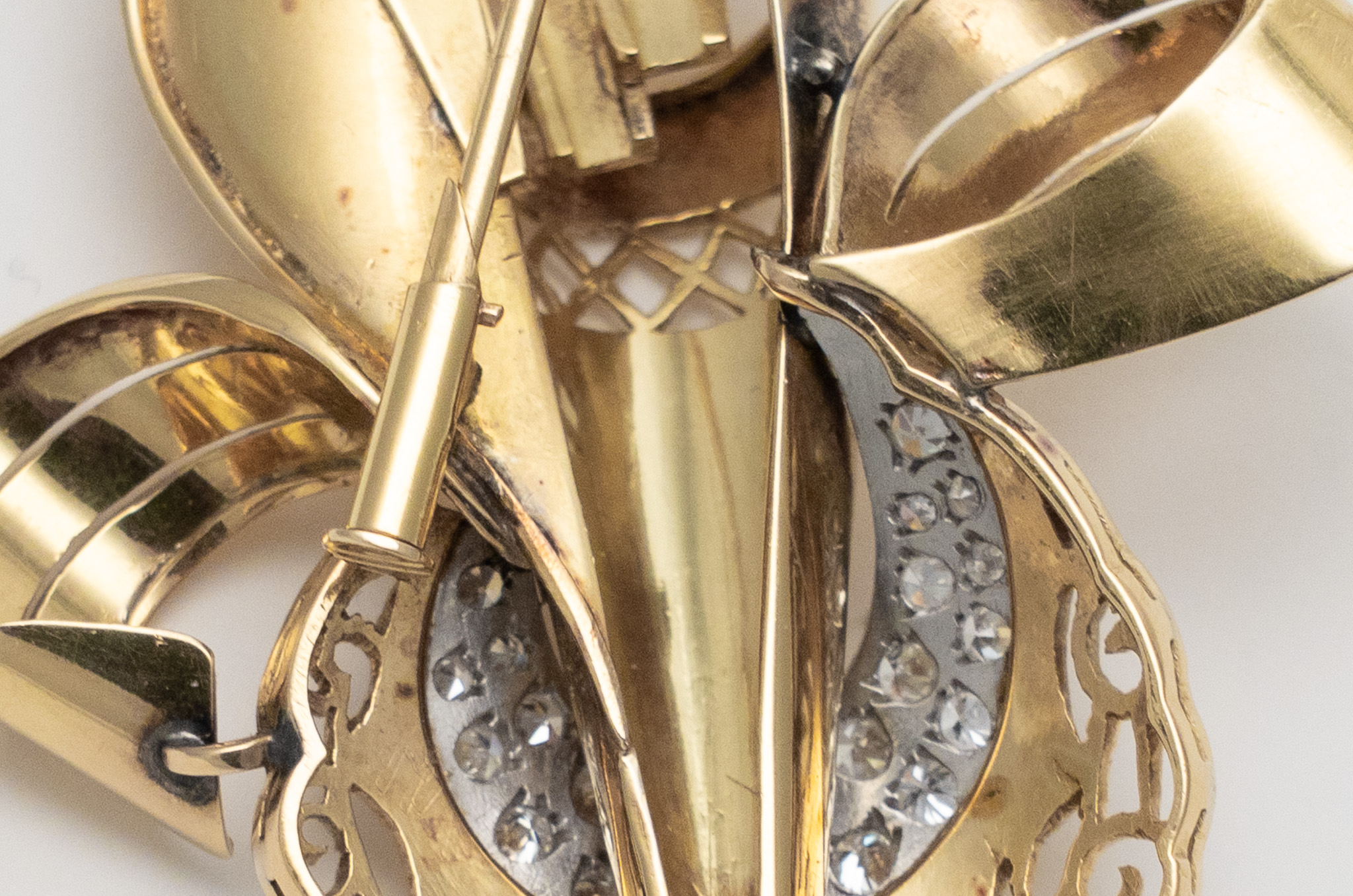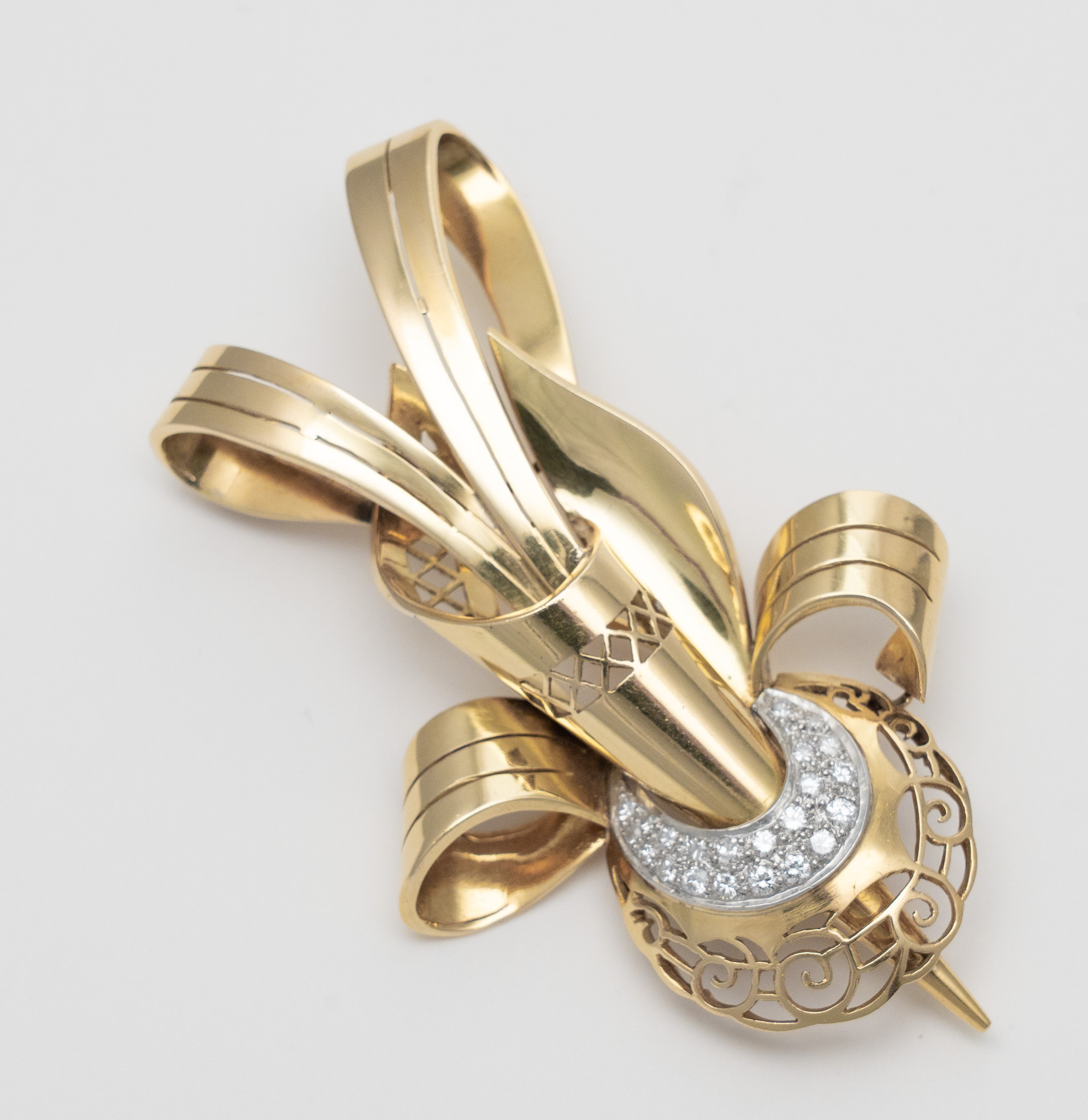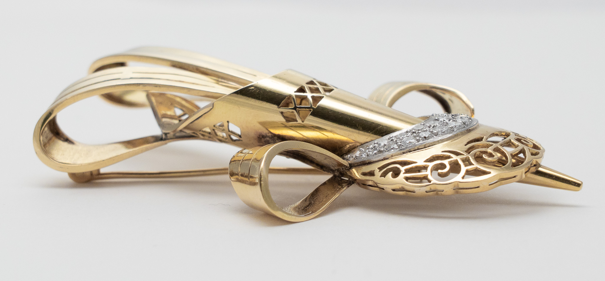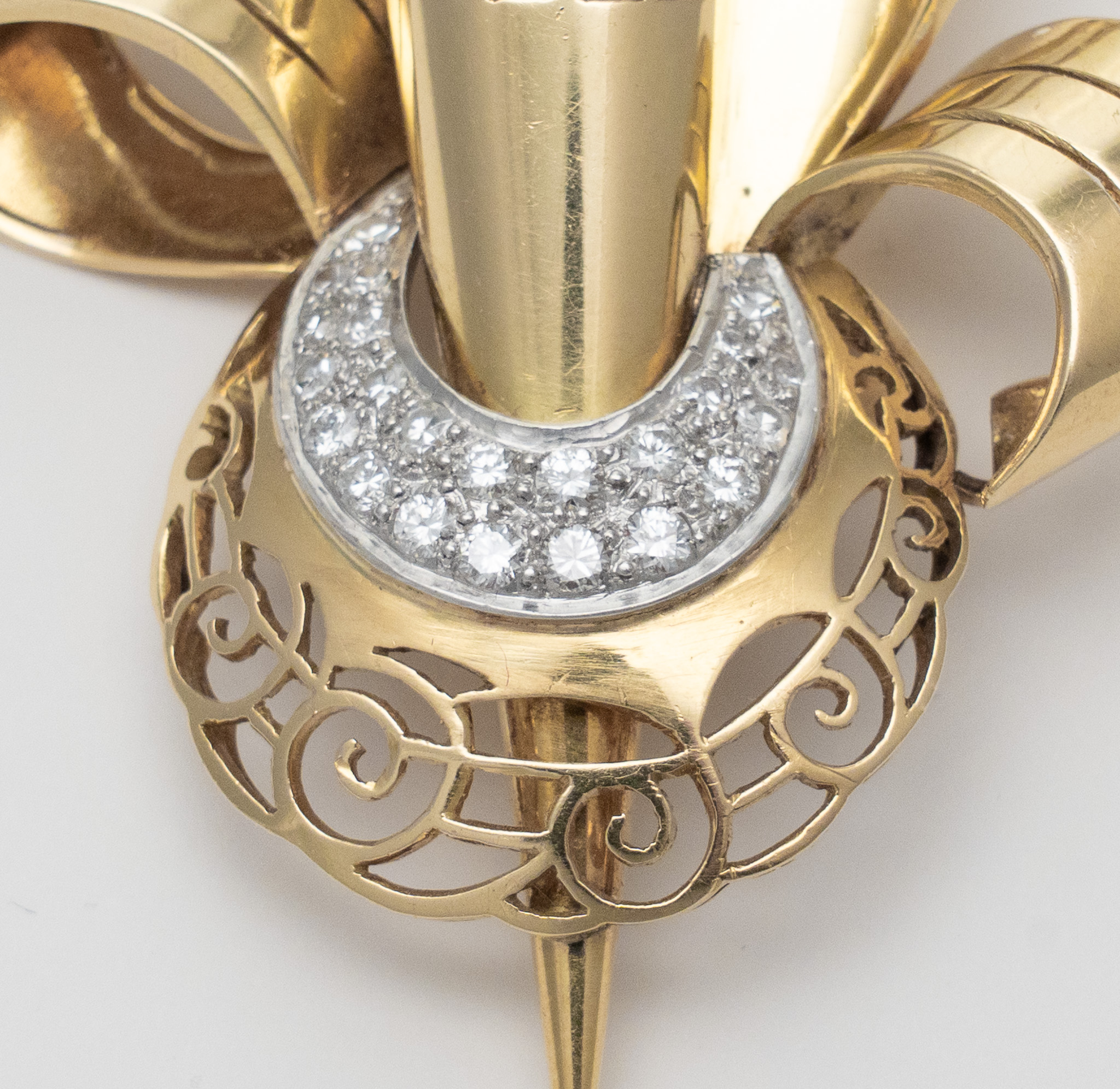Eine solide Brosche gearbeitet in 18 Karat Gelbgold (750/1000), besetzt mit 23 Achtkant-Diamanten von zusammen ca. 1 ct.(Wesselton/VS). Das Design ist im Stil der 1940er- bis 1950er-Jahre gehalten und zeigt ein kunstvoll geschwungenes, florales Motiv mit durchbrochen gearbeiteten Goldelementen. Das Gesamtgewicht der Brosche beträgt 34,2 Gramm.