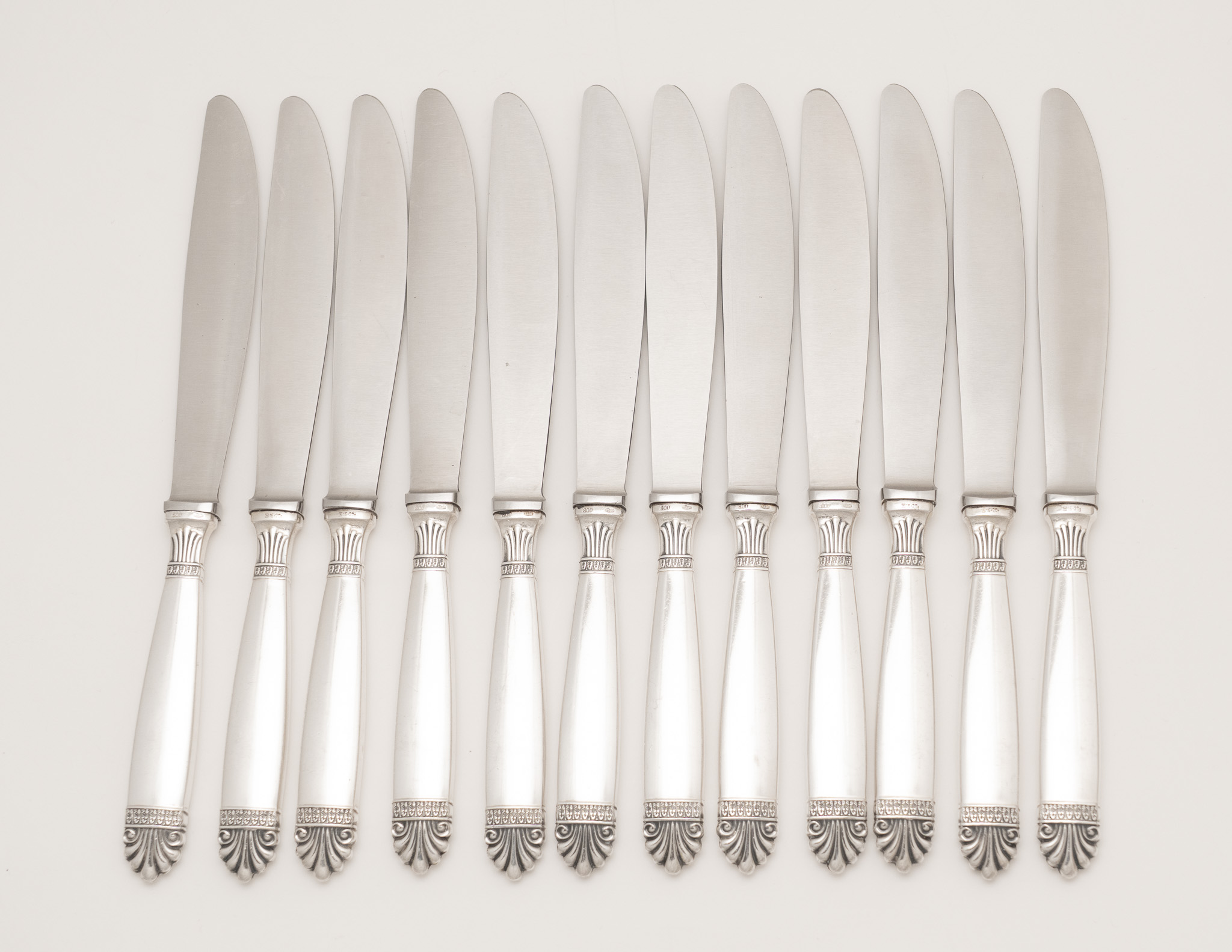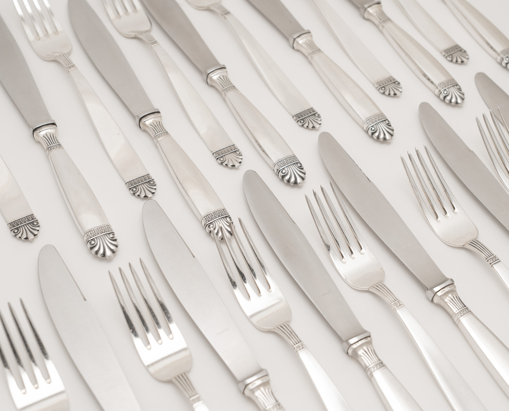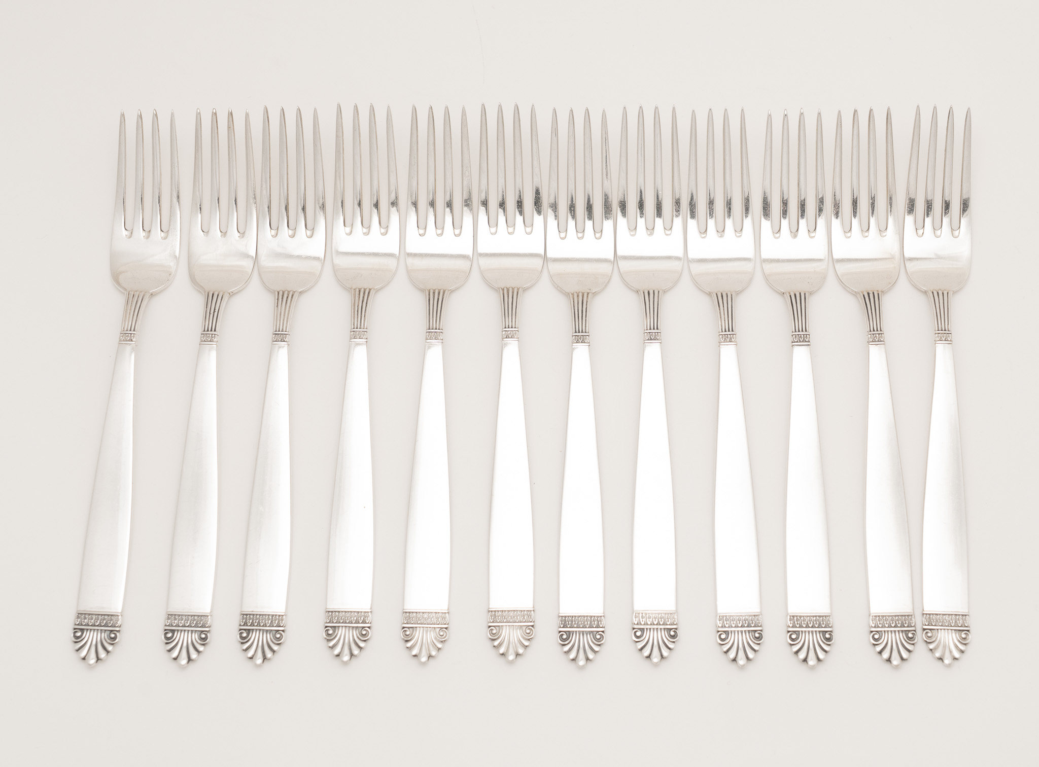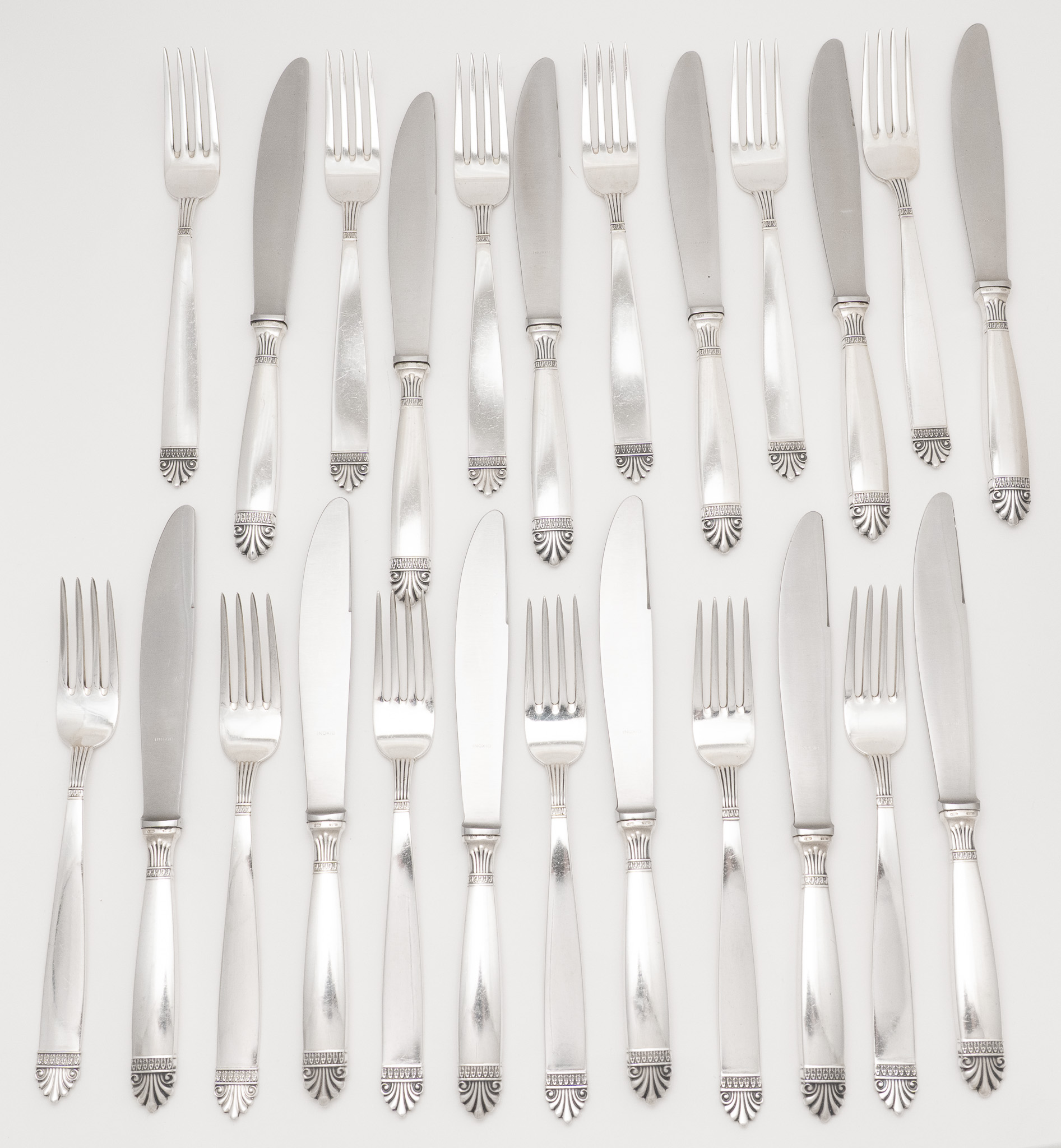 Ein elegantes, 24-teiliges italienisches Vorspeisebesteck aus 800er Silber für sechs Personen, bestehend aus jeweils zwölf Gabeln und zwölf Messern. Italien, nach 1968, gearbeitet im Stil des Art Déco. Glatter, hochpolierter Dekor mit Kanneluren, Lorbeerfries und Palmette.