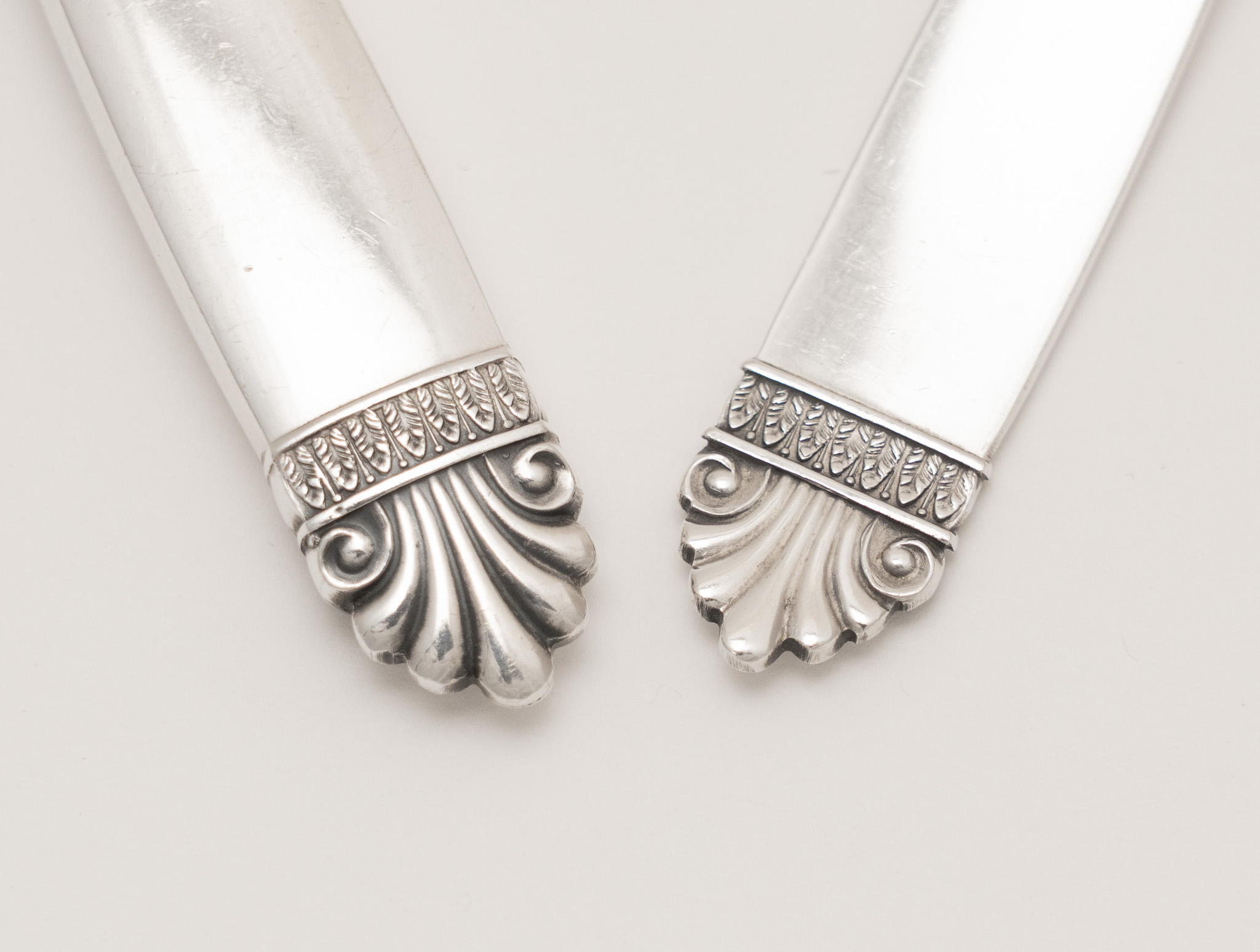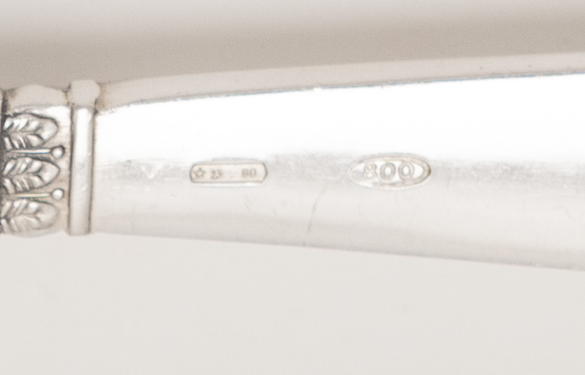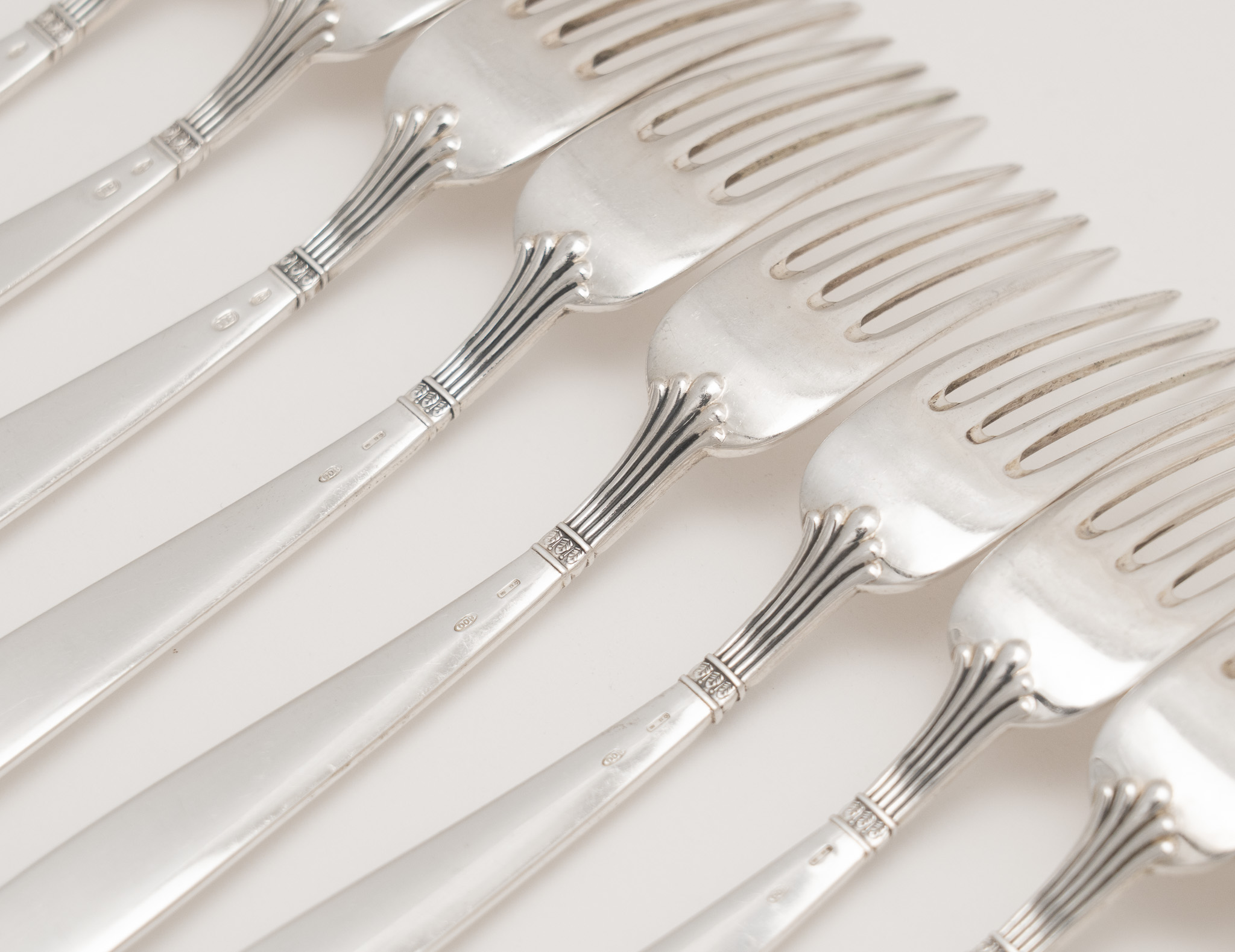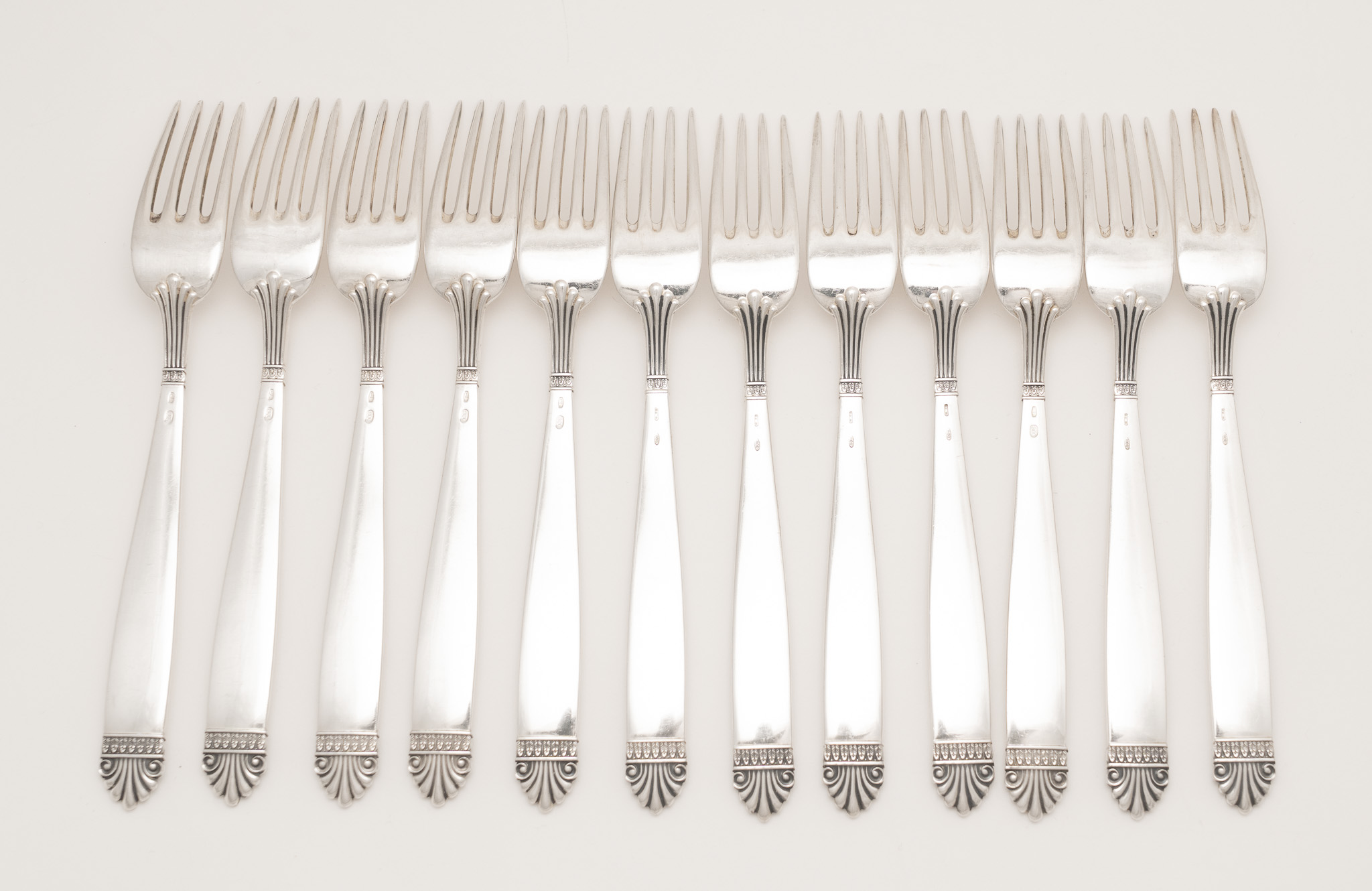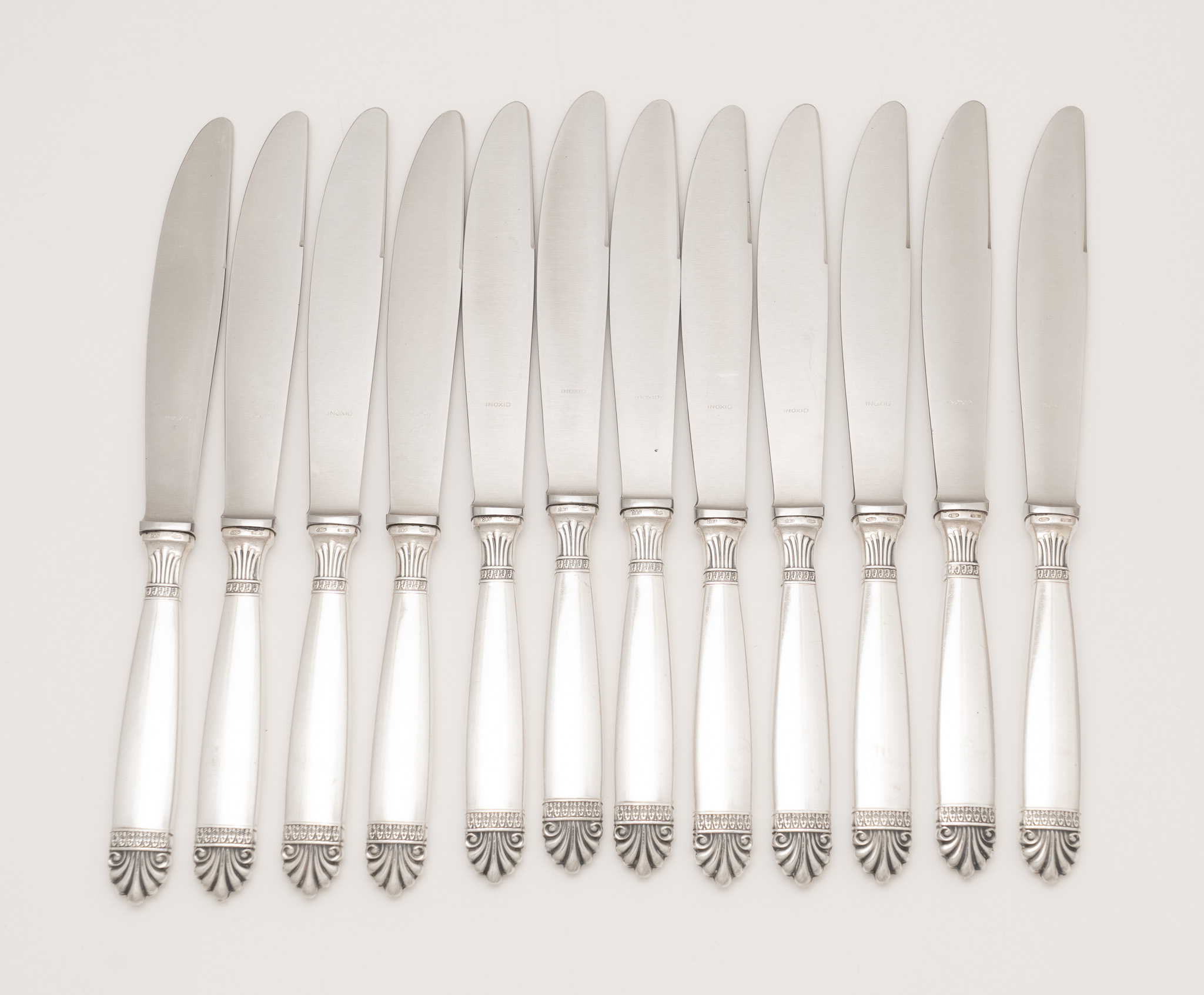 Ein elegantes, 24-teiliges italienisches Vorspeisebesteck aus 800er Silber für sechs Personen, bestehend aus jeweils zwölf Gabeln und zwölf Messern. Italien, nach 1968, gearbeitet im Stil des Art Déco. Glatter, hochpolierter Dekor mit Kanneluren, Lorbeerfries und Palmette.