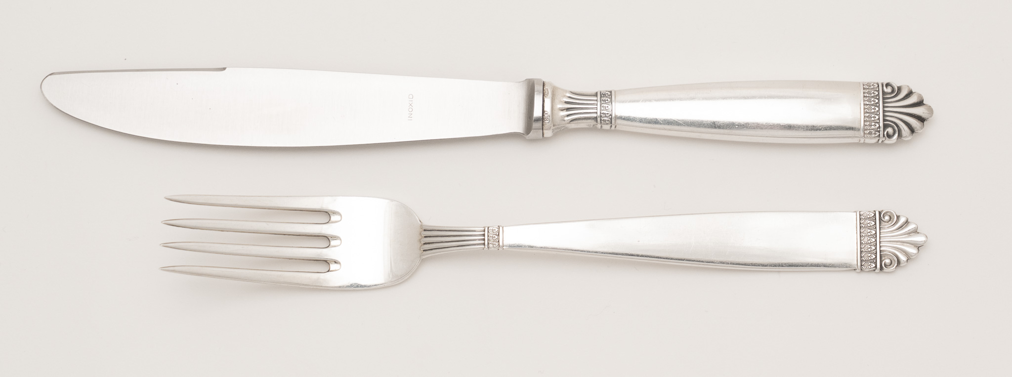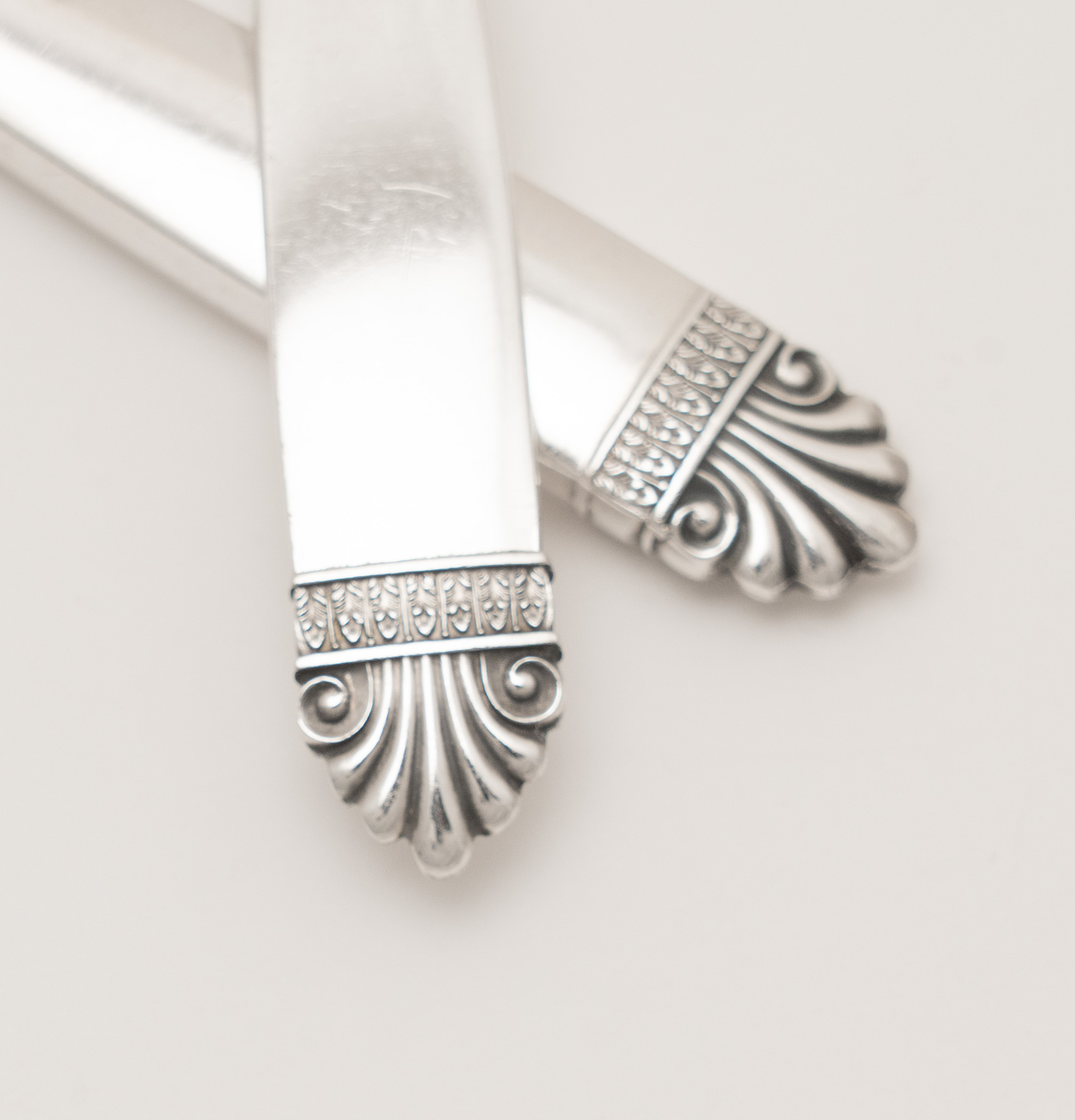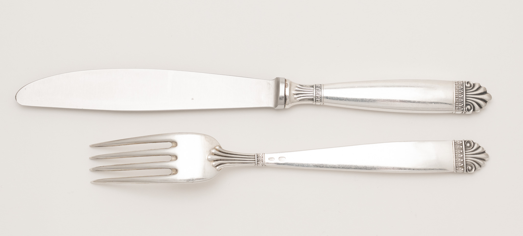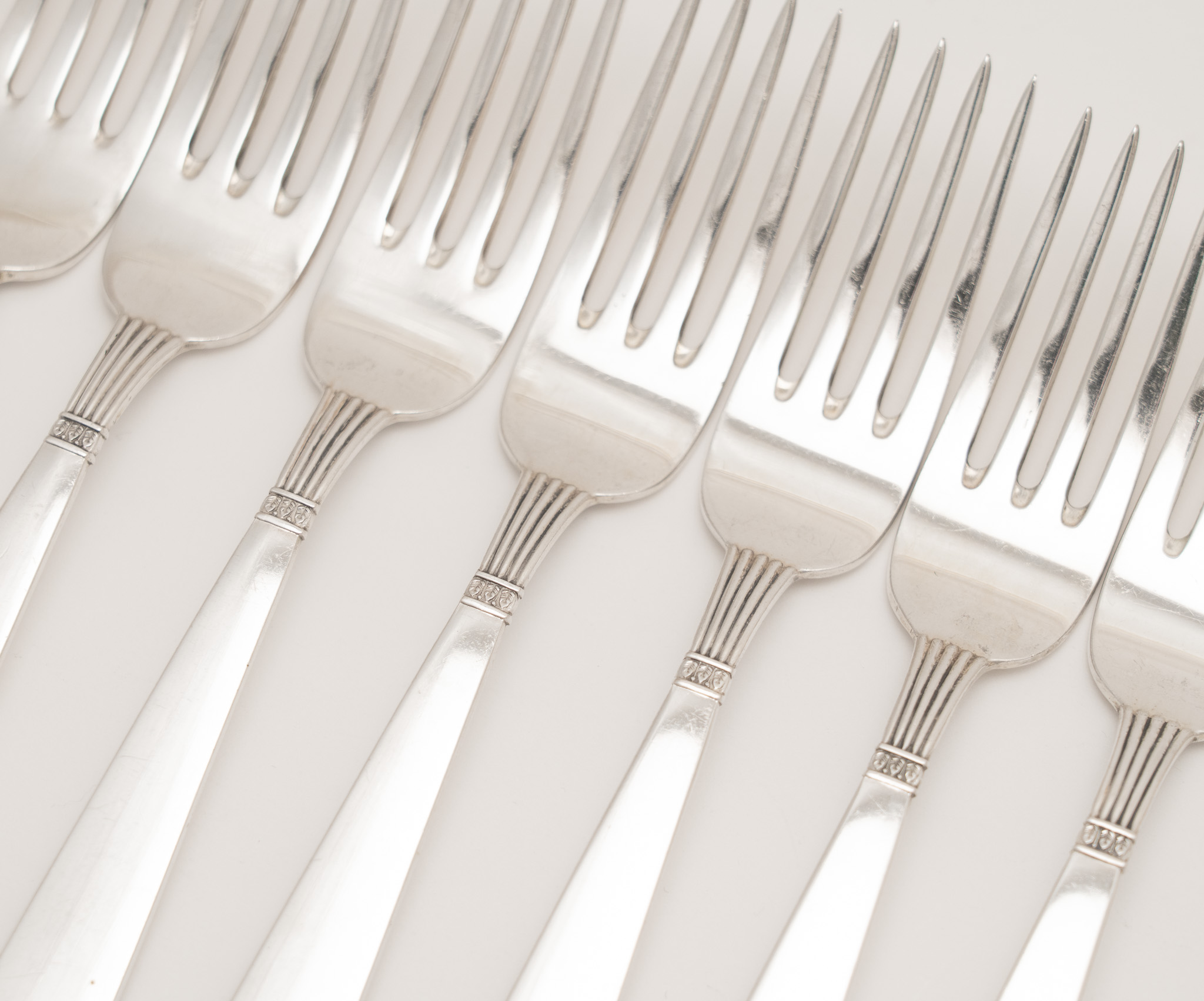 Ein elegantes, 24-teiliges italienisches Vorspeisebesteck aus 800er Silber für sechs Personen, bestehend aus jeweils zwölf Gabeln und zwölf Messern. Italien, nach 1968, gearbeitet im Stil des Art Déco. Glatter, hochpolierter Dekor mit Kanneluren, Lorbeerfries und Palmette.