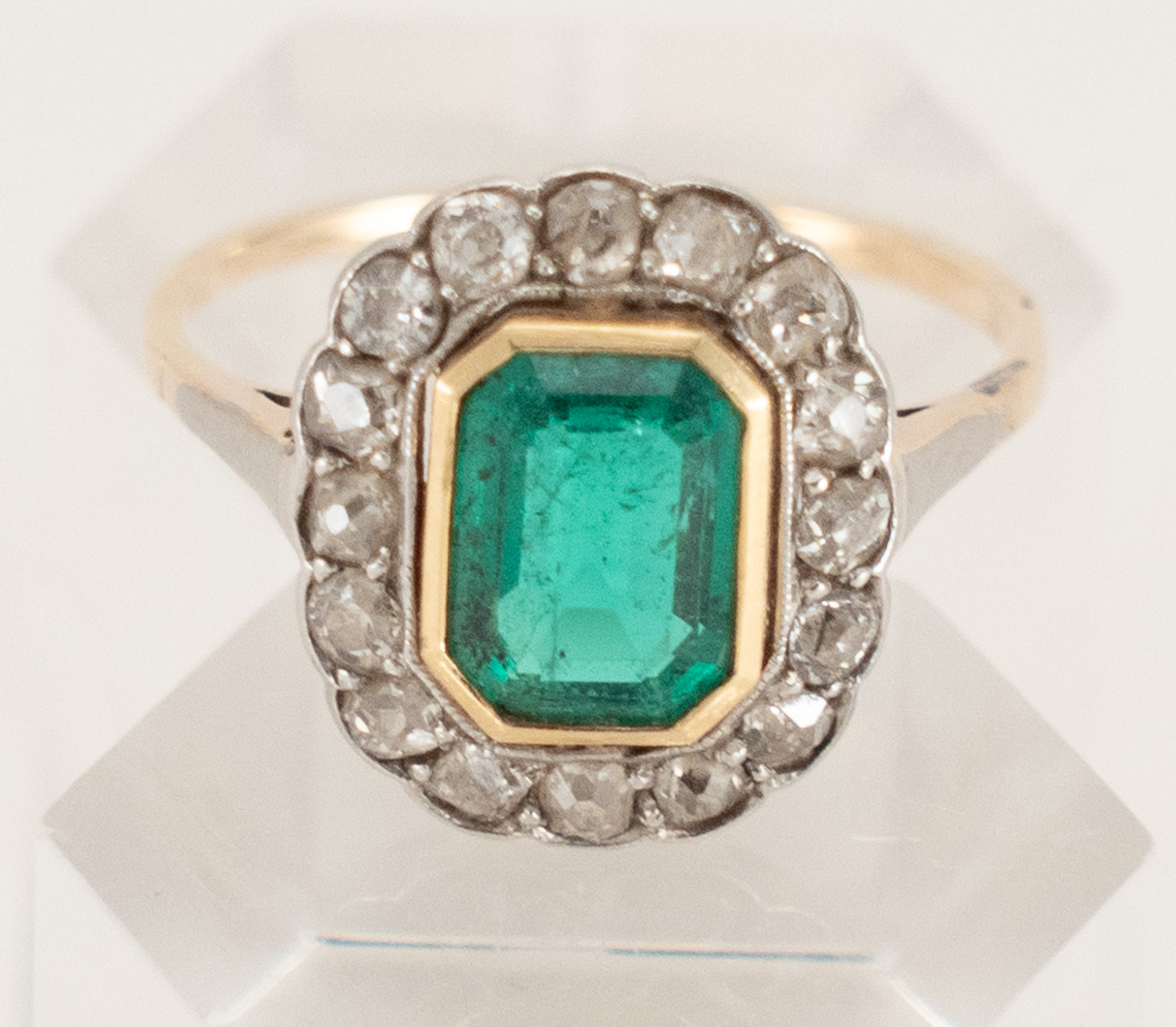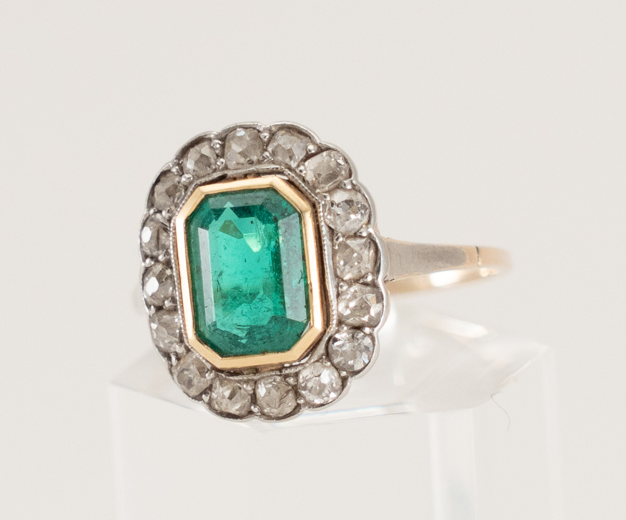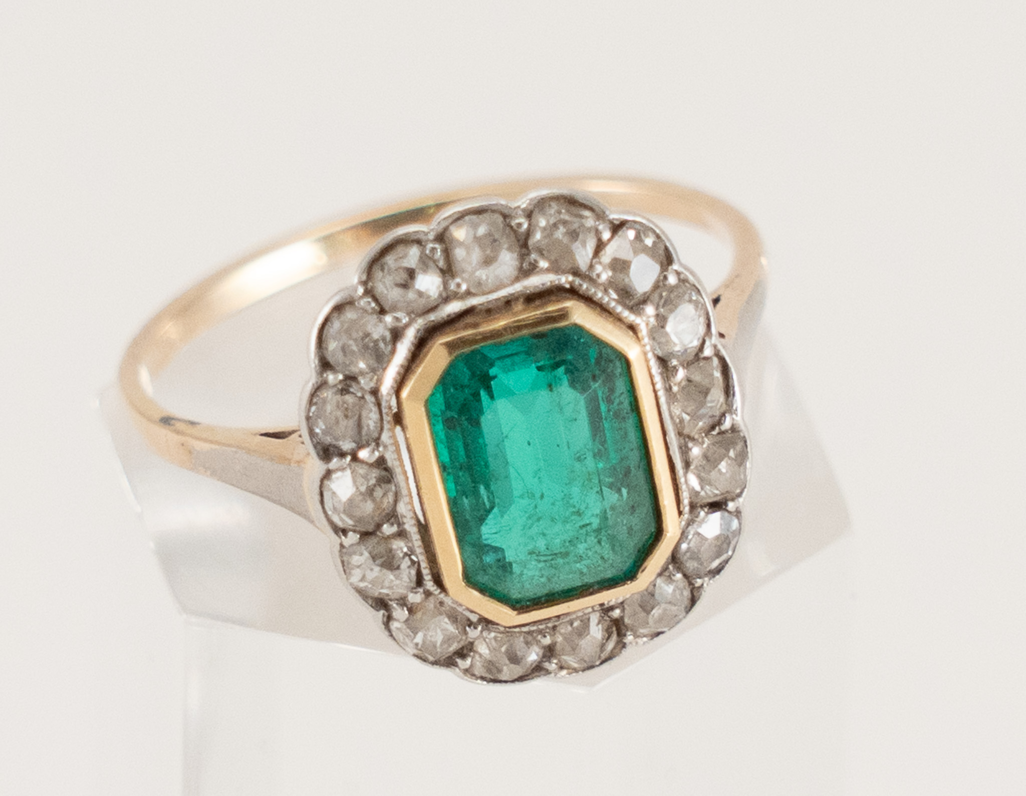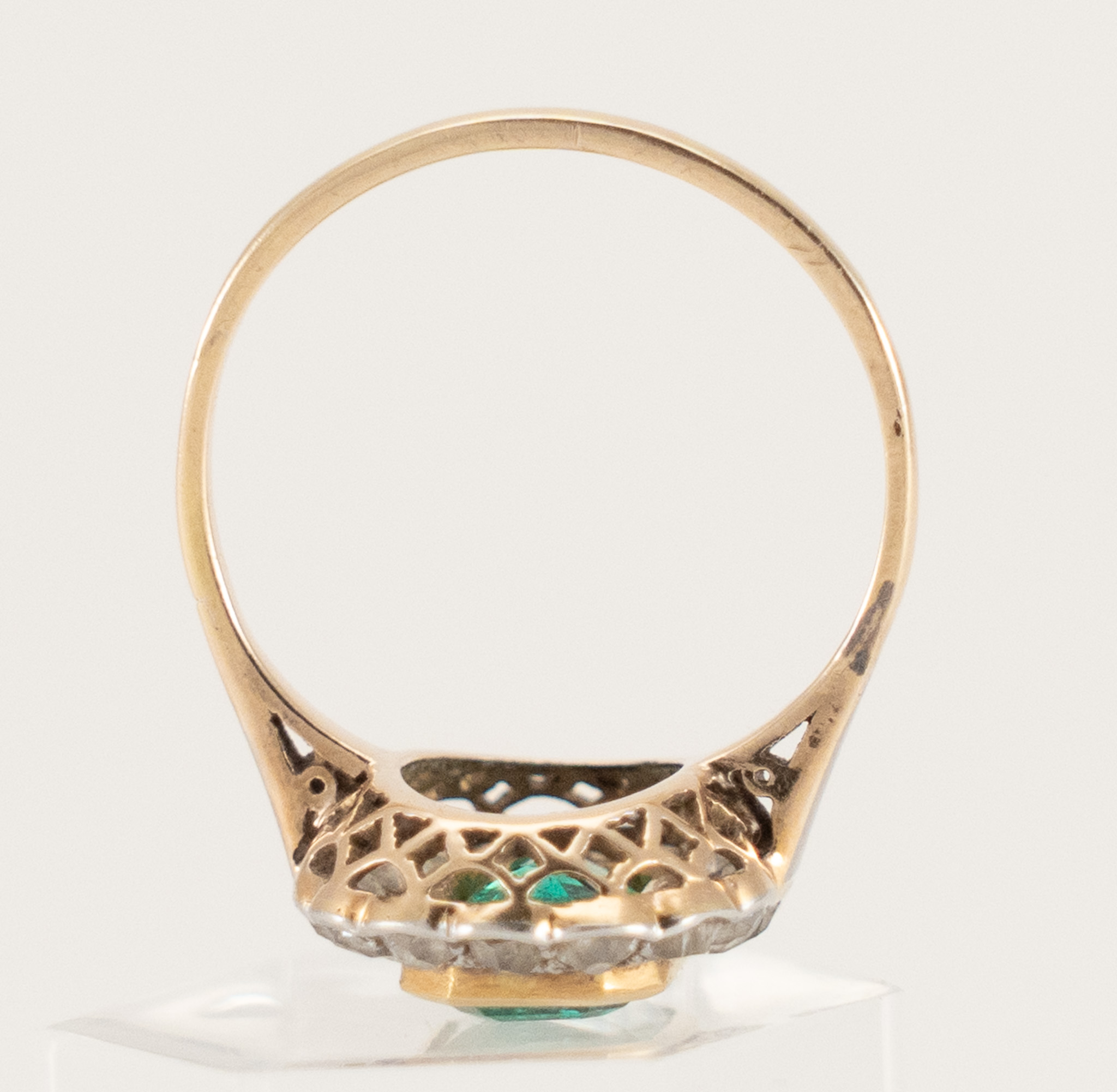 Ein feiner Art-déco Ring in 14 Karat Gelbgold und Platin mit einem Smaragd und 16 Diamanten