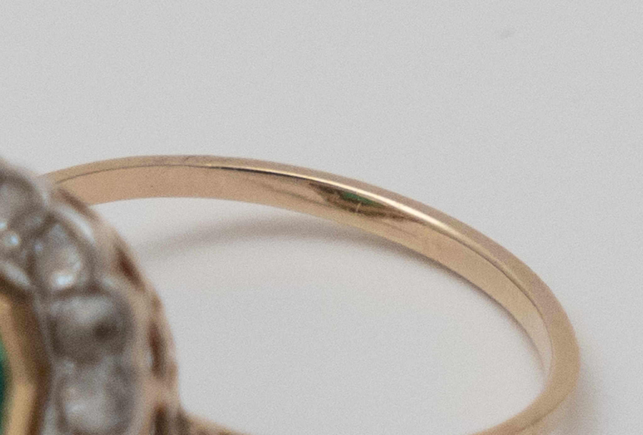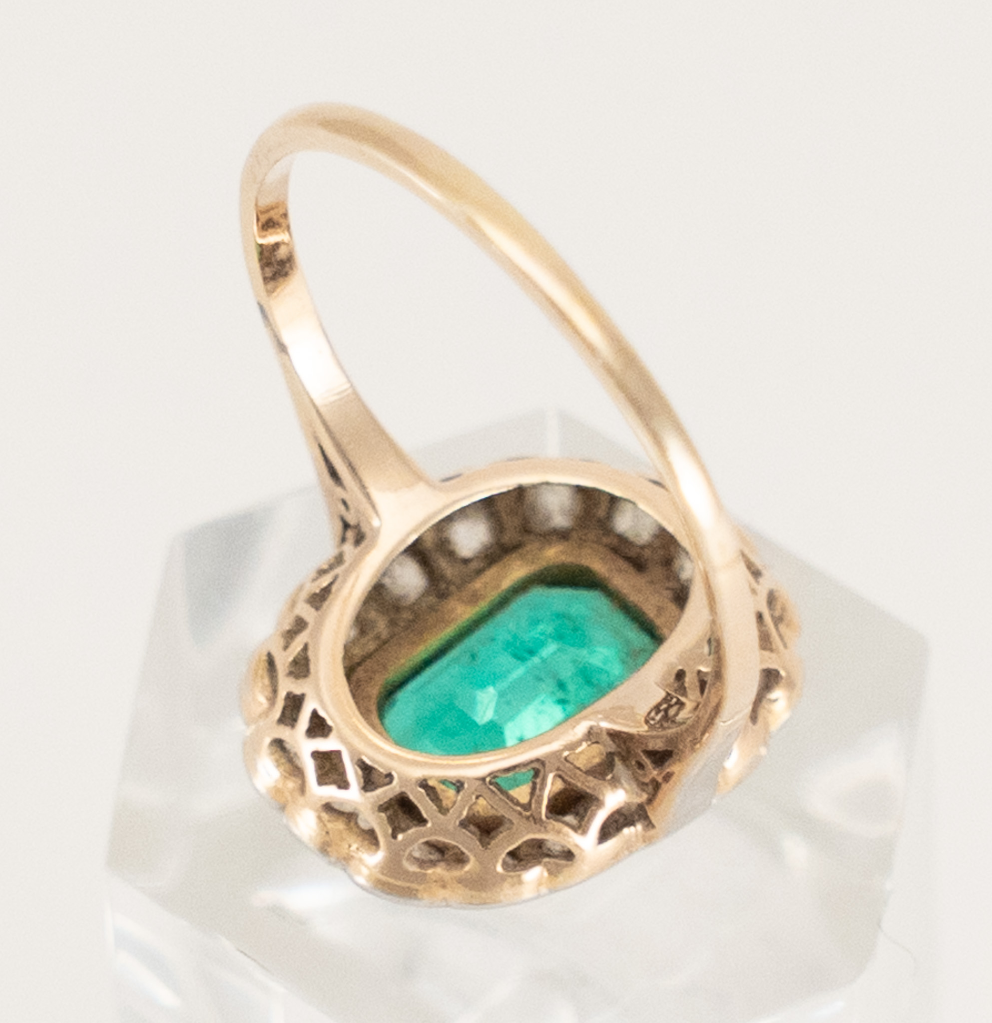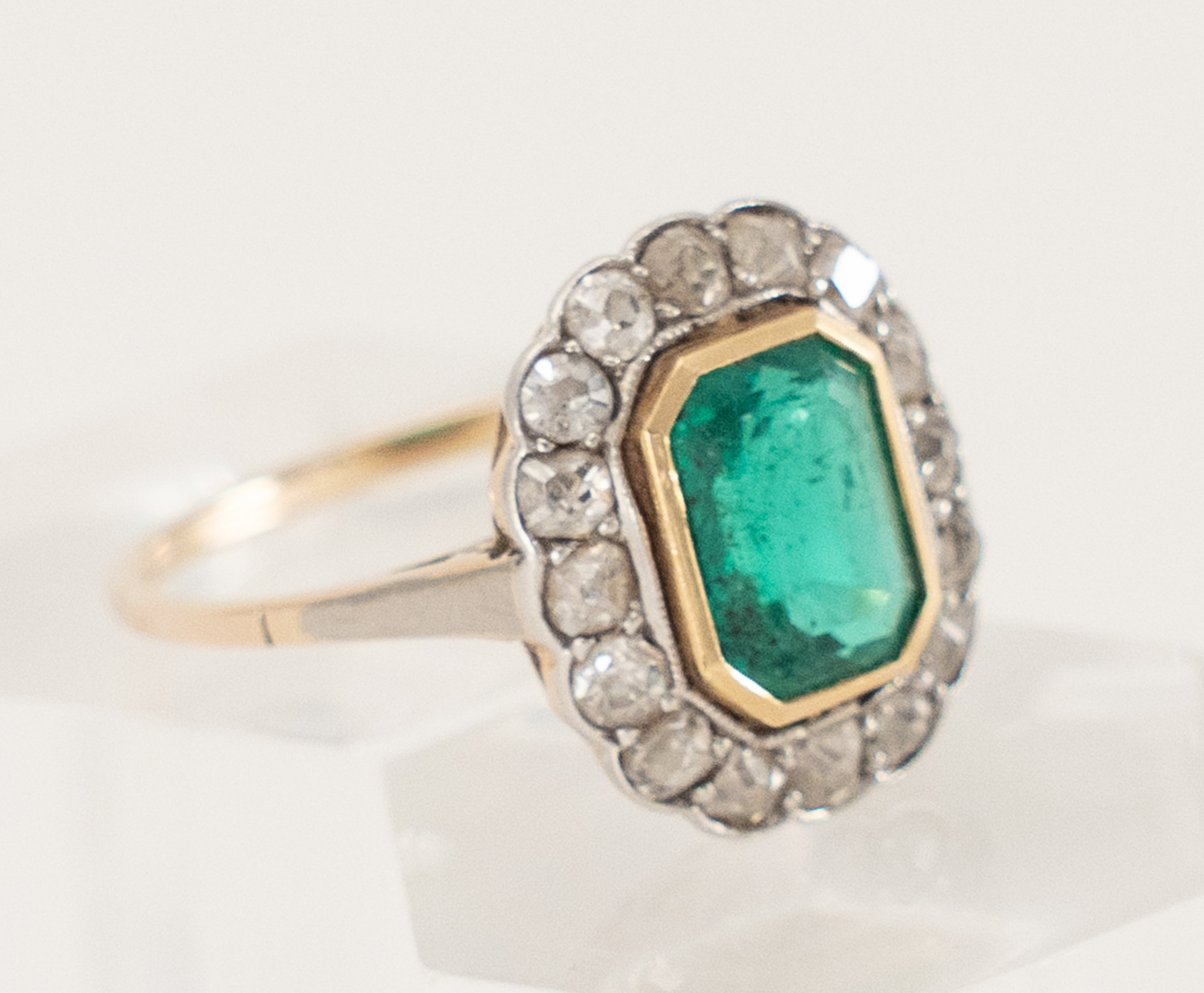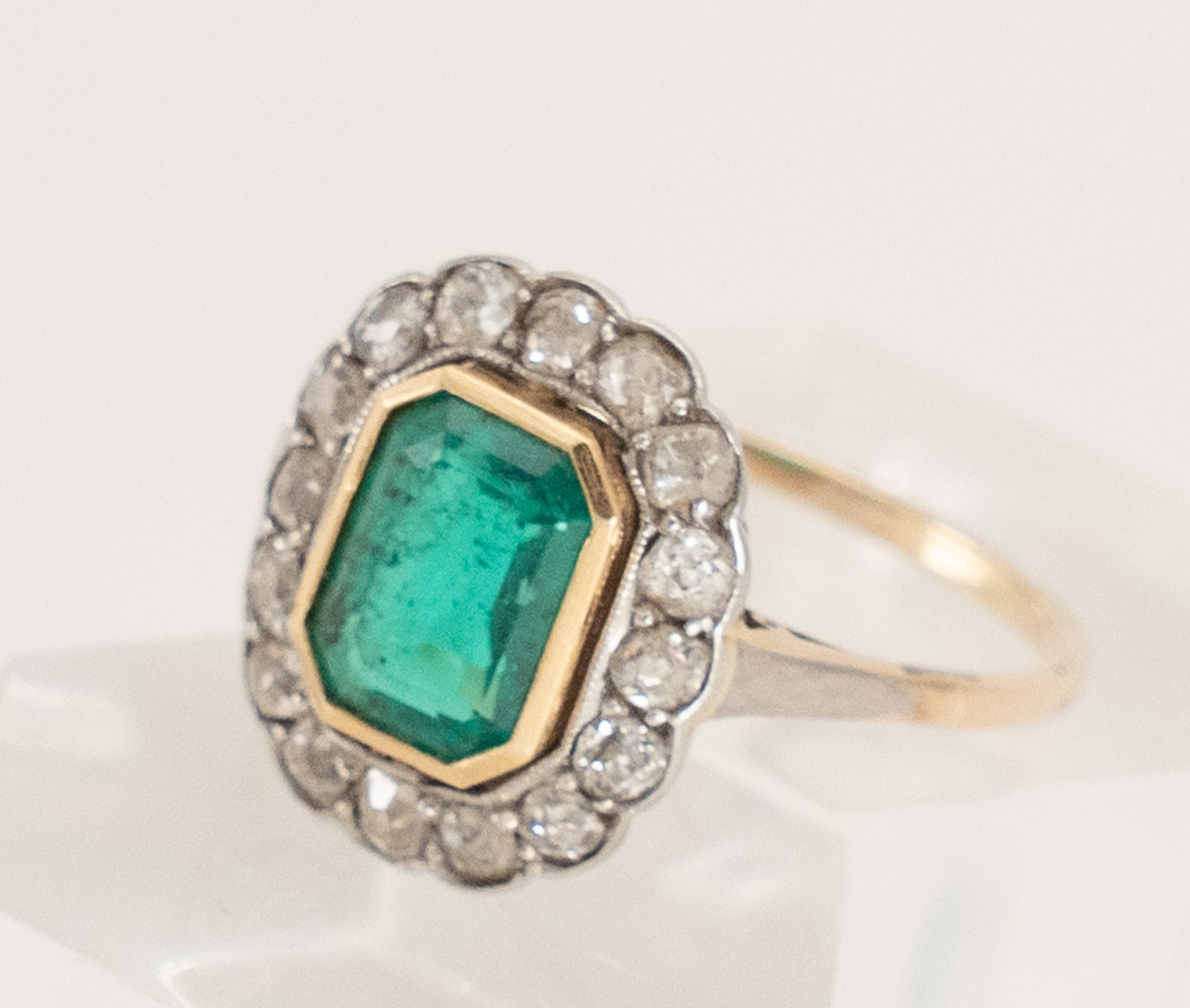 Ein feiner Art-déco Ring in 14 Karat Gelbgold und Platin mit einem Smaragd und 16 Diamanten