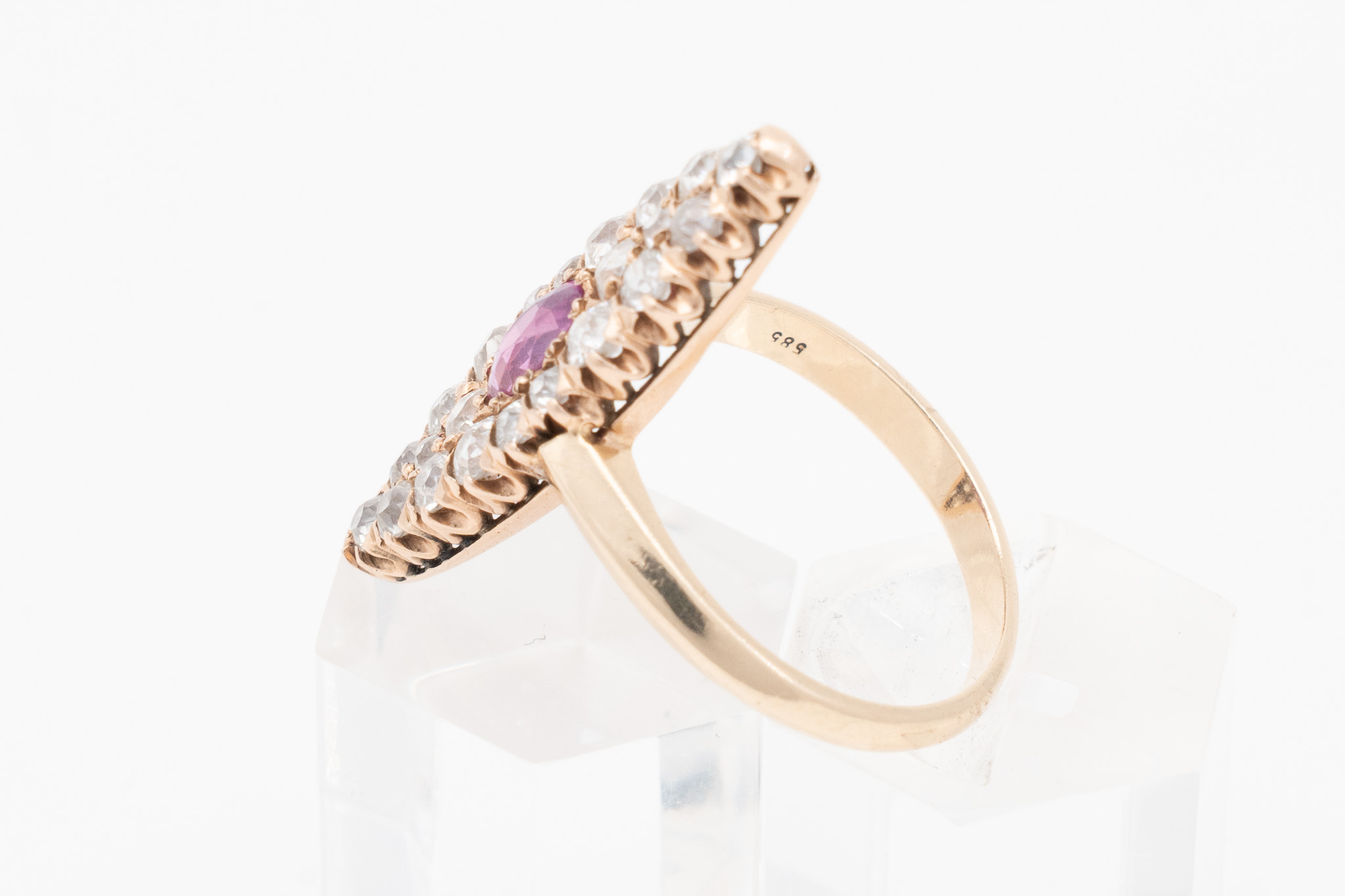 in Navette-Ring, gearbeitet in 14 Karat Gelbgold (585/1000) mit 22 Altschliff-Diamanten von zusammen ca. 1,62 ct. Und einem roten Saphir von ca. 0,5 ct.