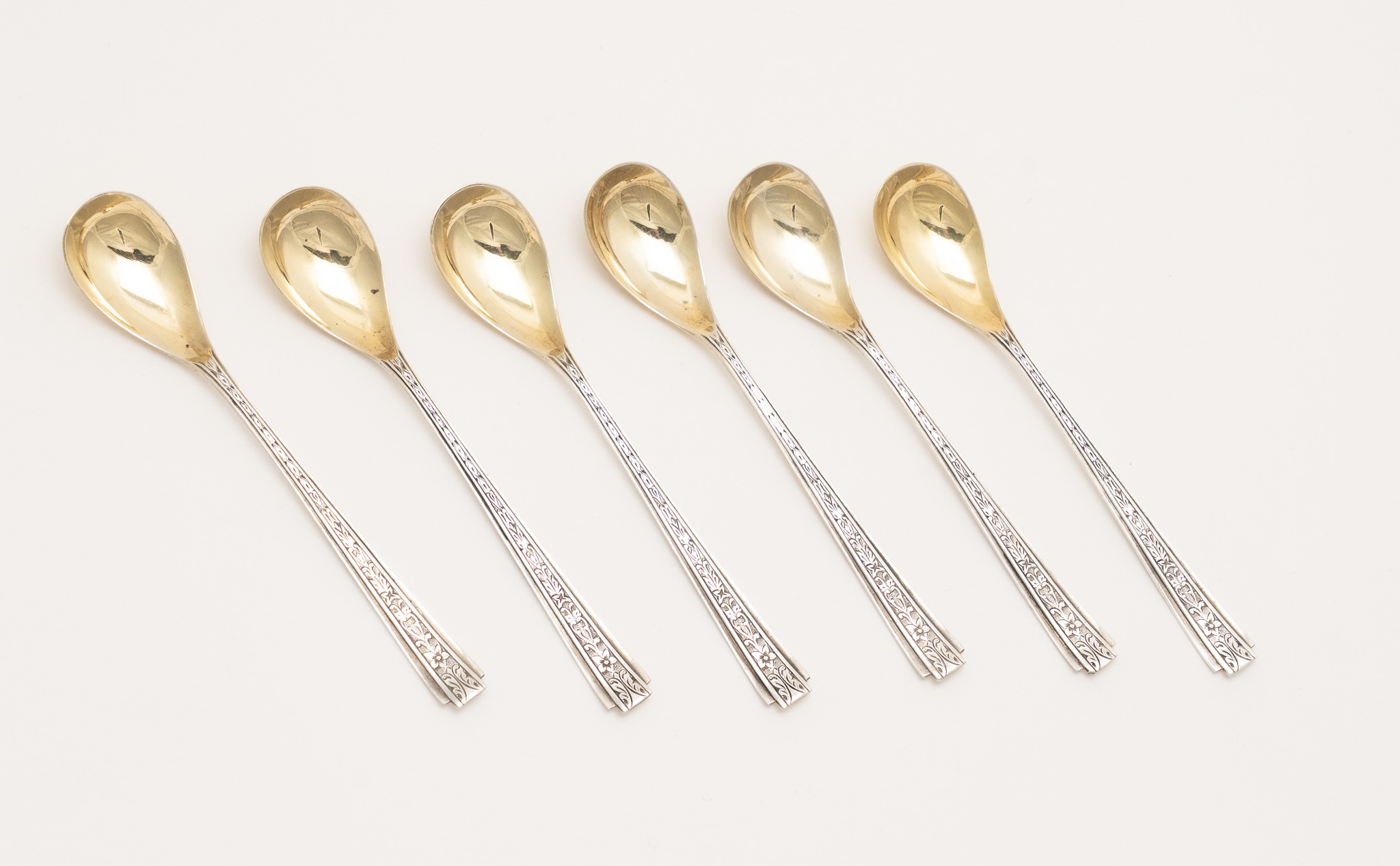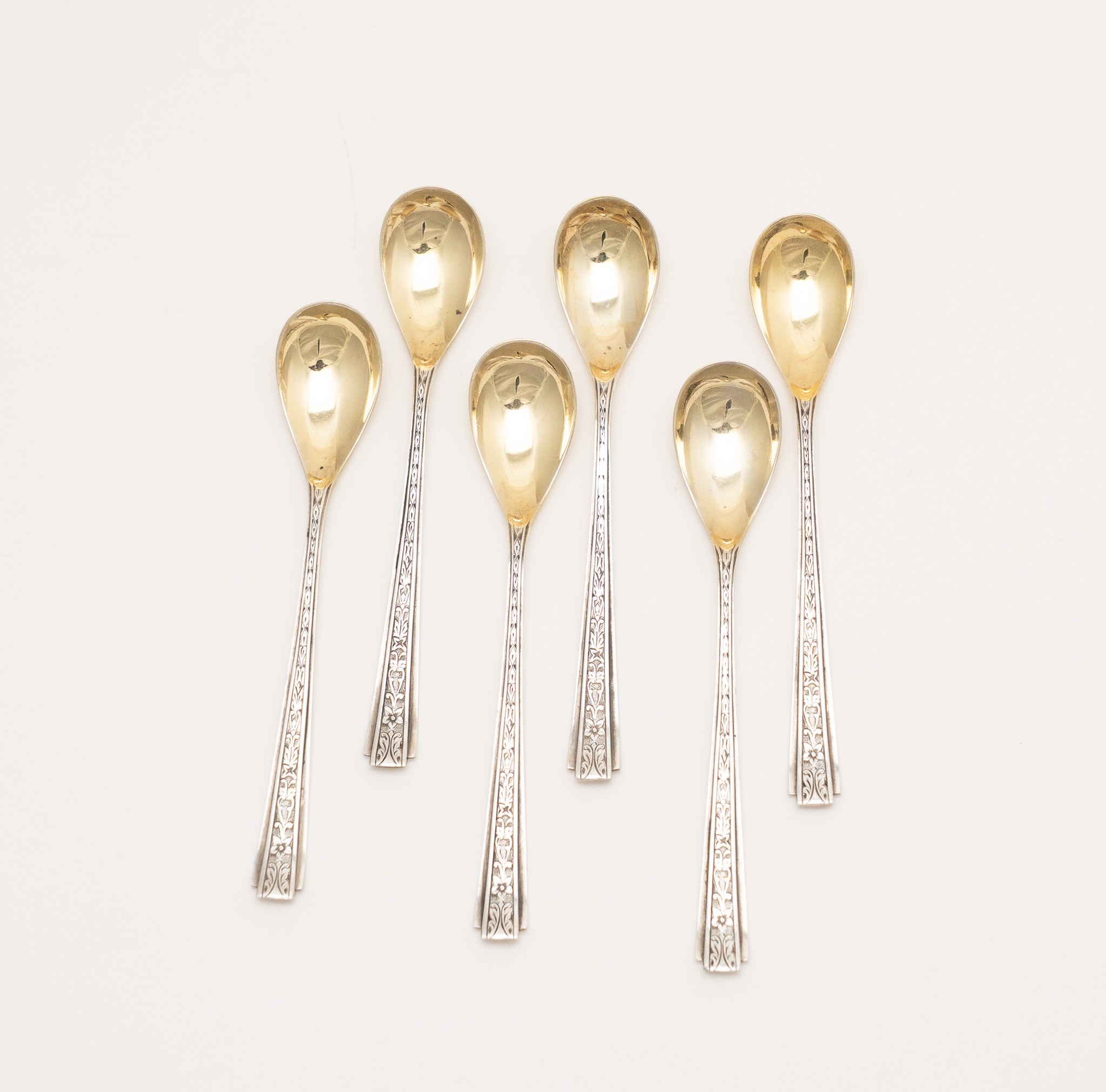 Ein Satz von sechs niederländischen Eierlöffeln, gearbeitet in 833er Silber, Niederlande, 1. Hälfte 20. Jahrhundert.