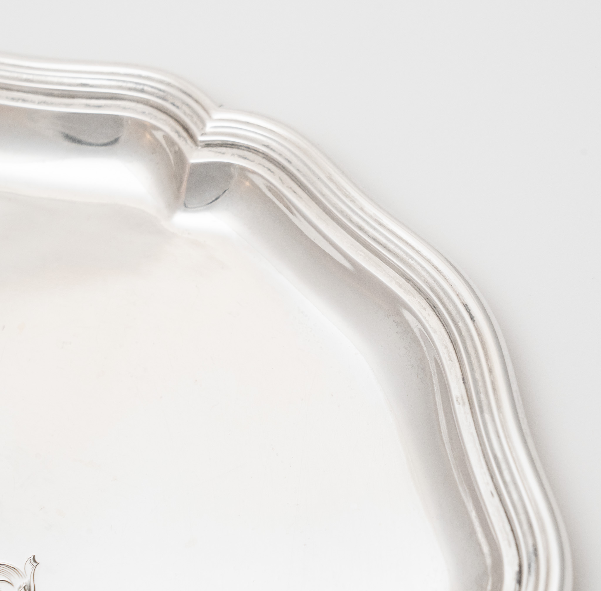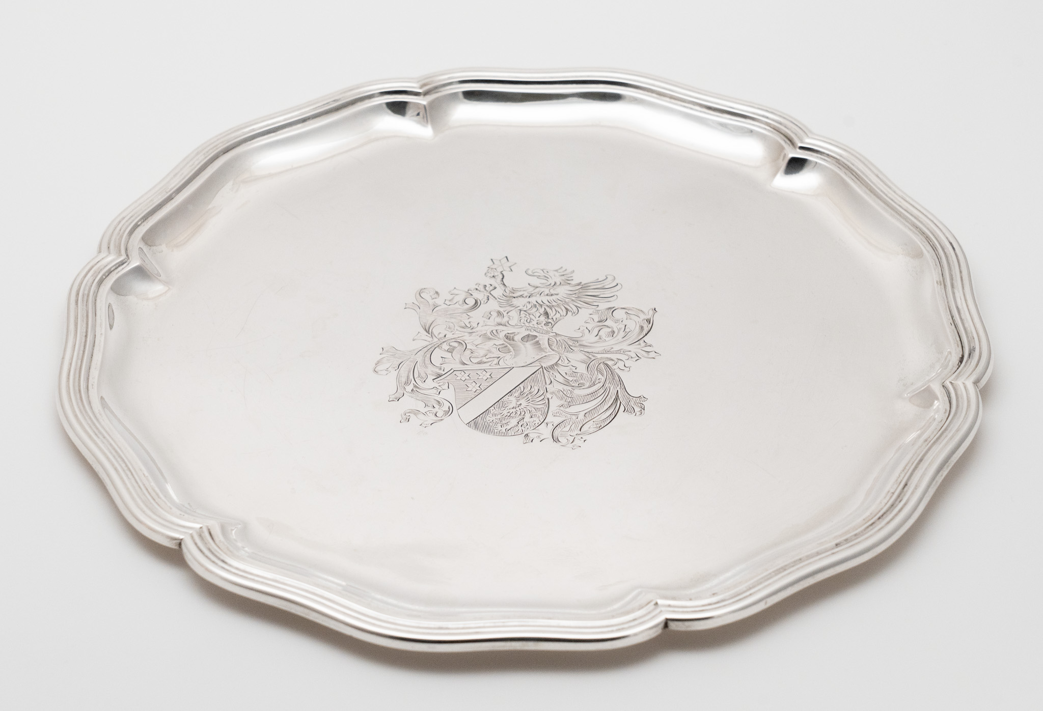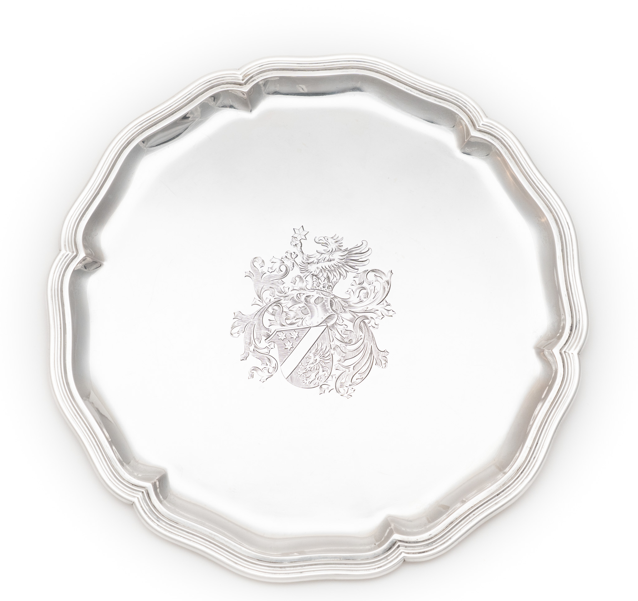 Ein solides rundes Tablett mit Chippendale-Rand, mehrfach eingezogen und geschweift. Glatter, hochpolierter Dekor. Mittig eine sehr feine Wappengravur mit einem Wappenschild, Helmzier und einem Greif.