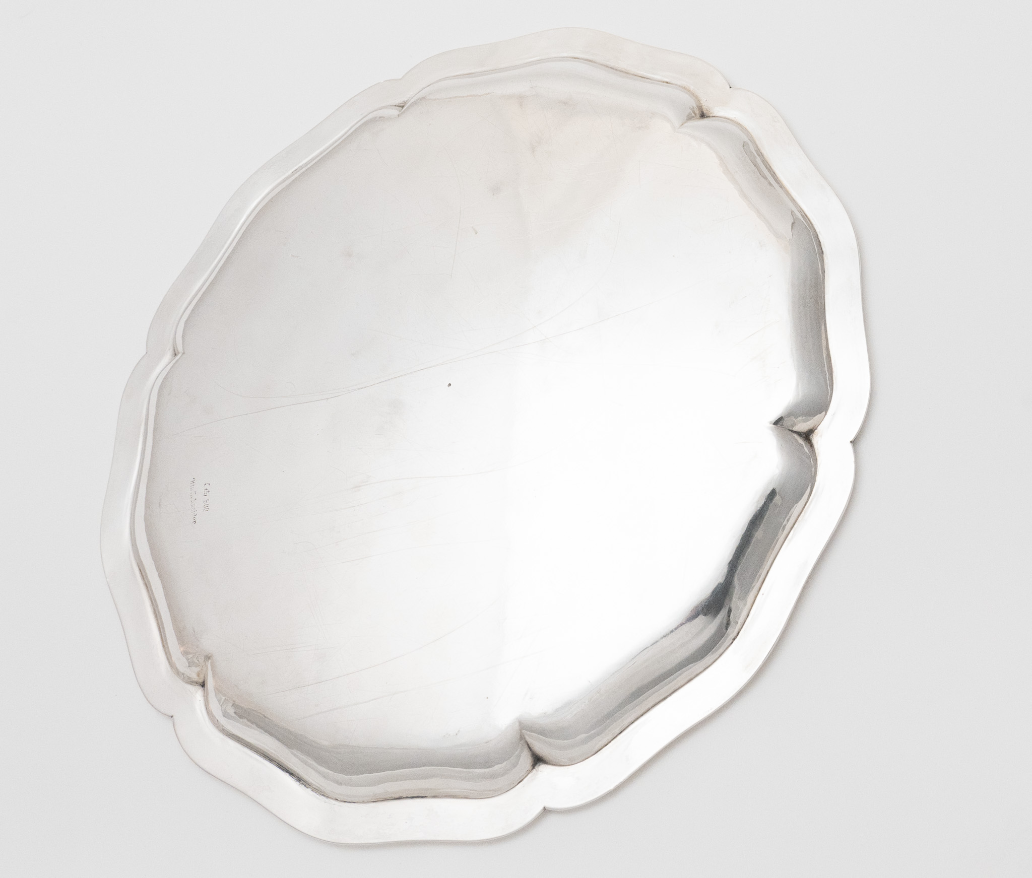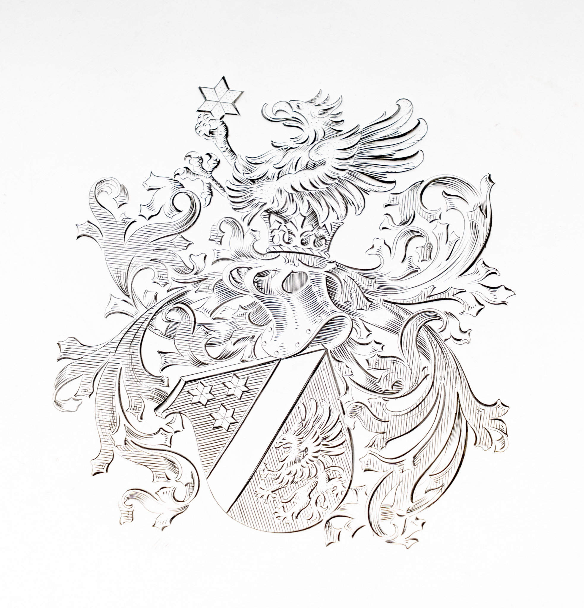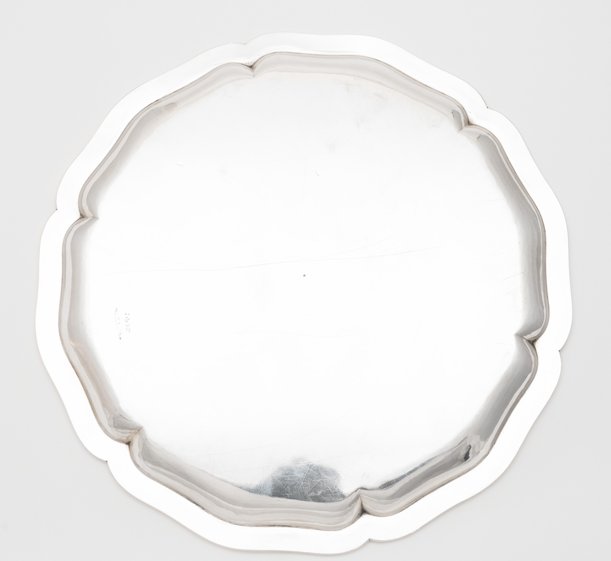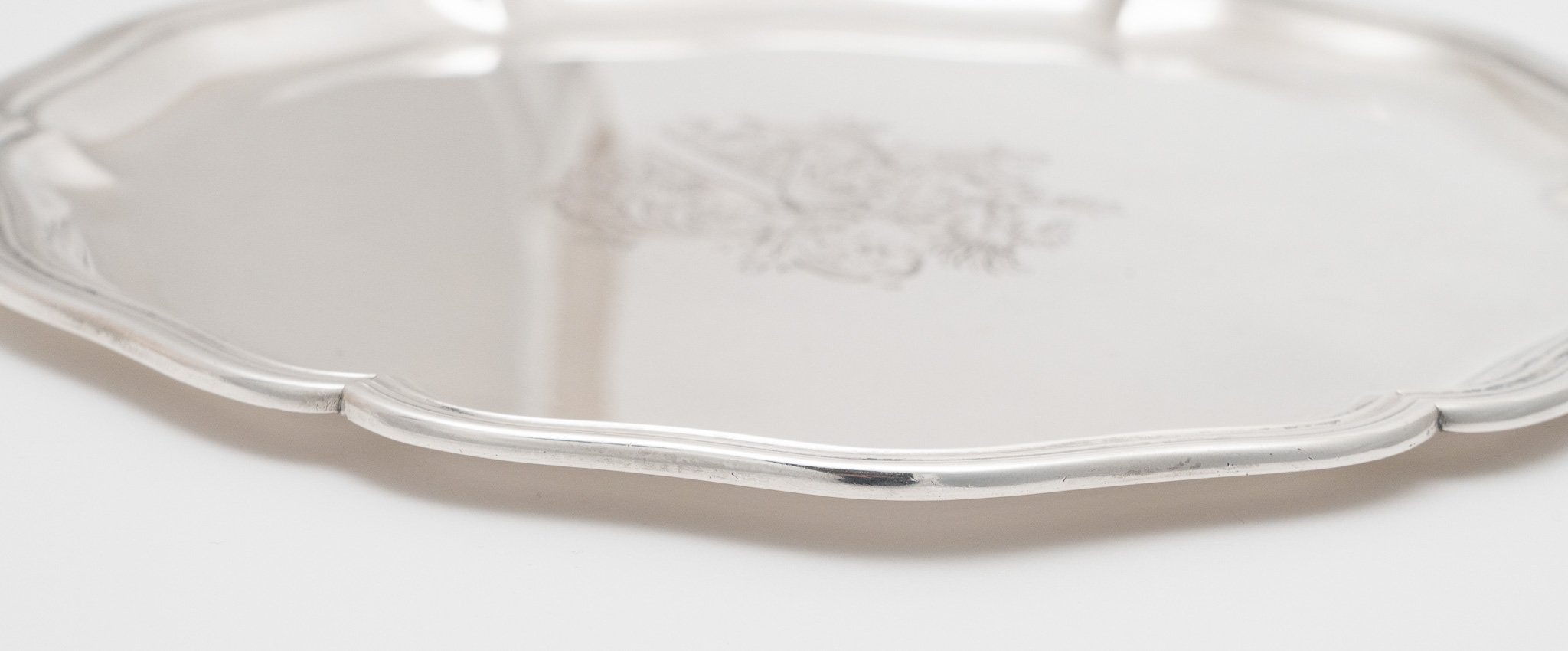 Ein solides rundes Tablett mit Chippendale-Rand, mehrfach eingezogen und geschweift. Glatter, hochpolierter Dekor. Mittig eine sehr feine Wappengravur mit einem Wappenschild, Helmzier und einem Greif.