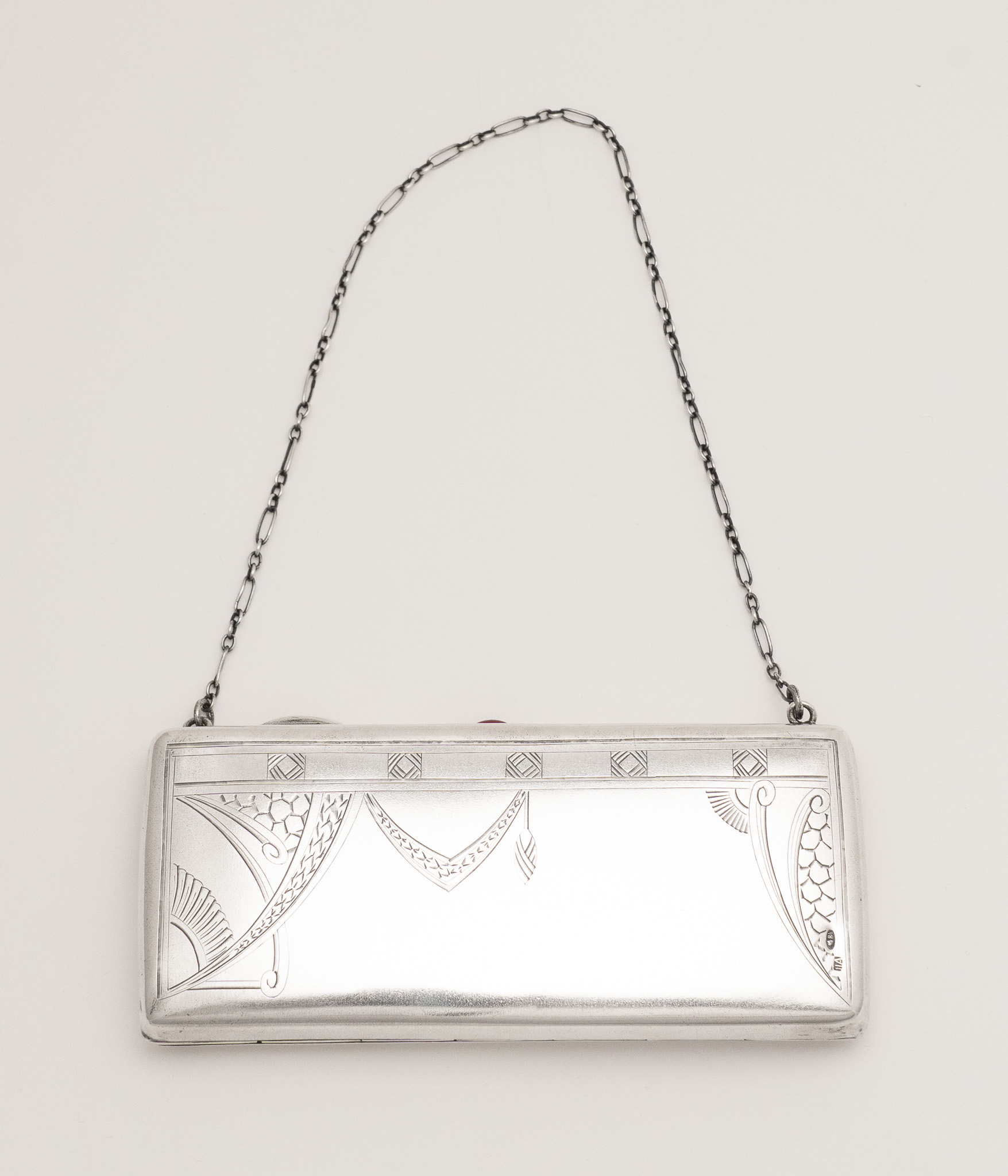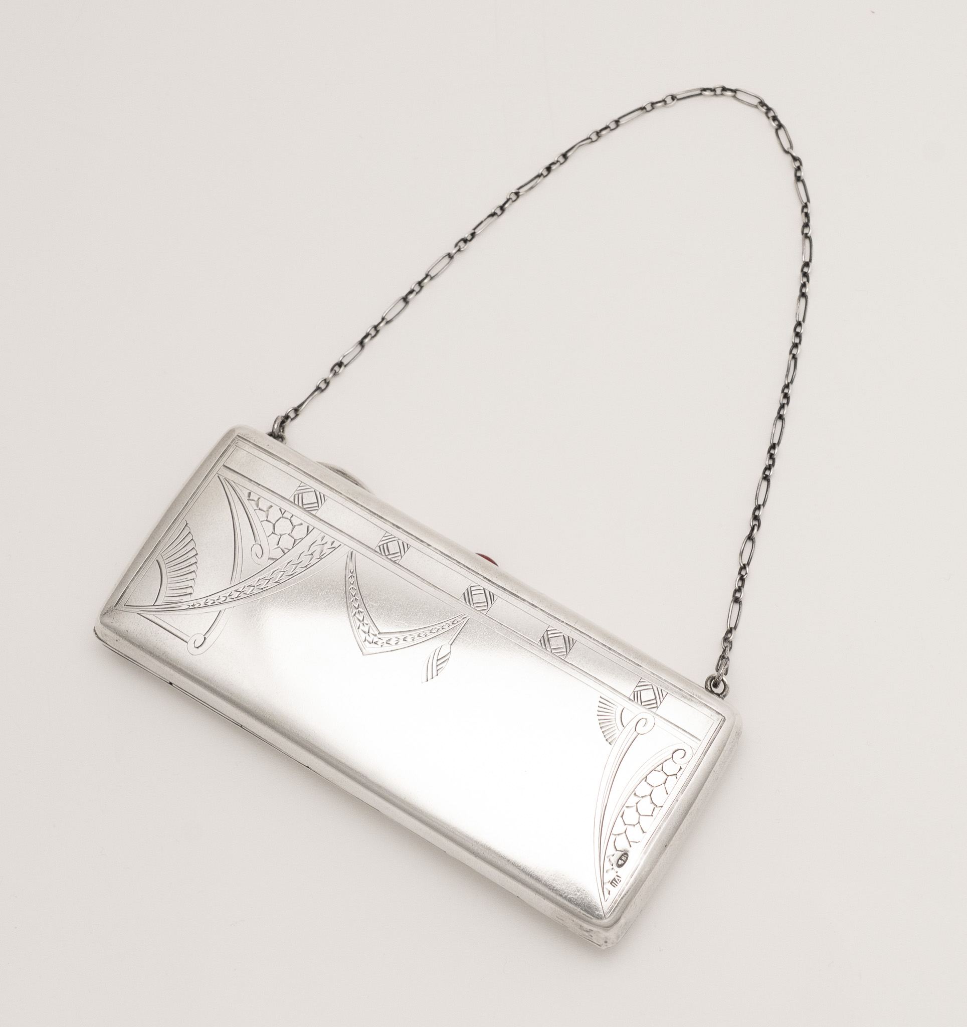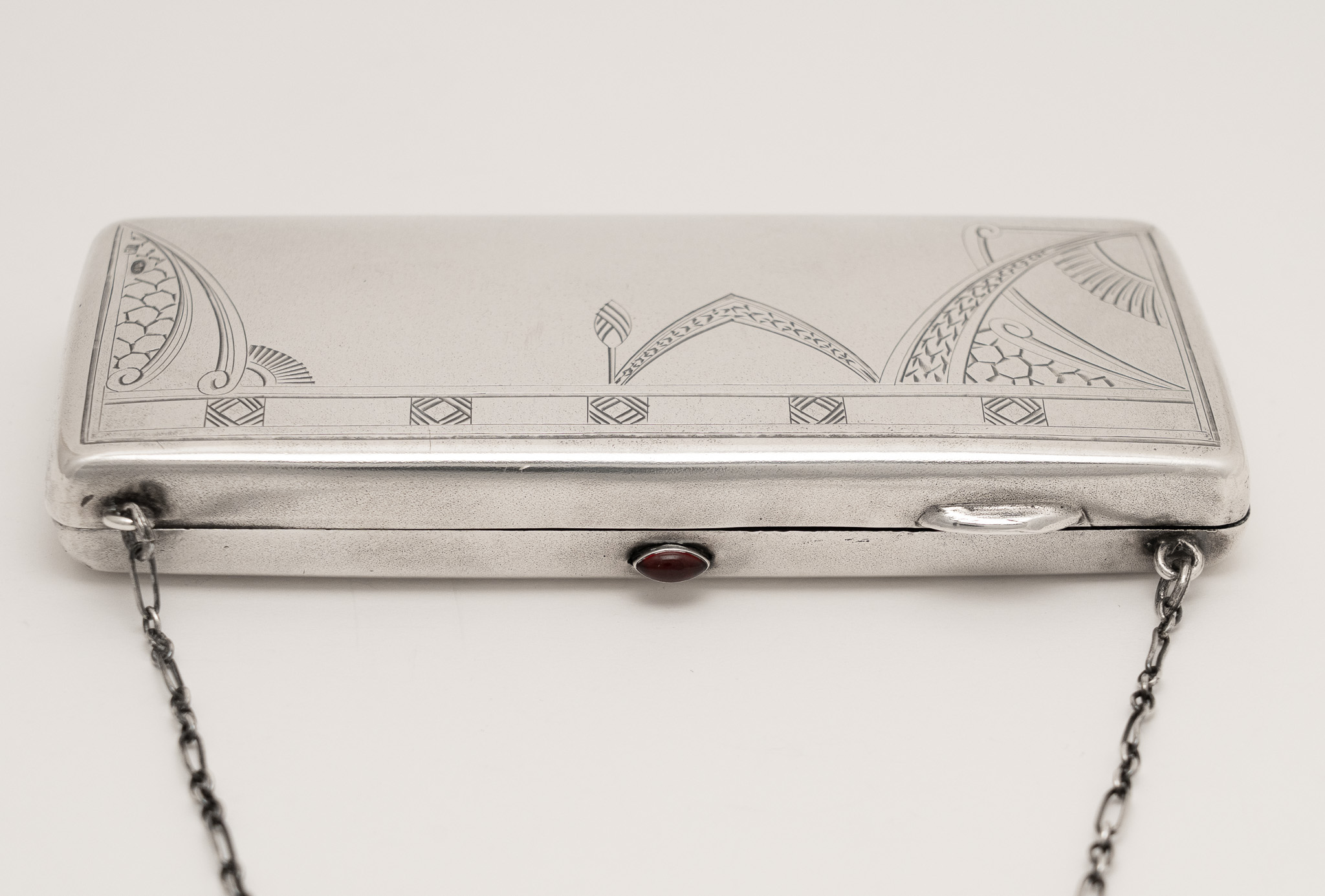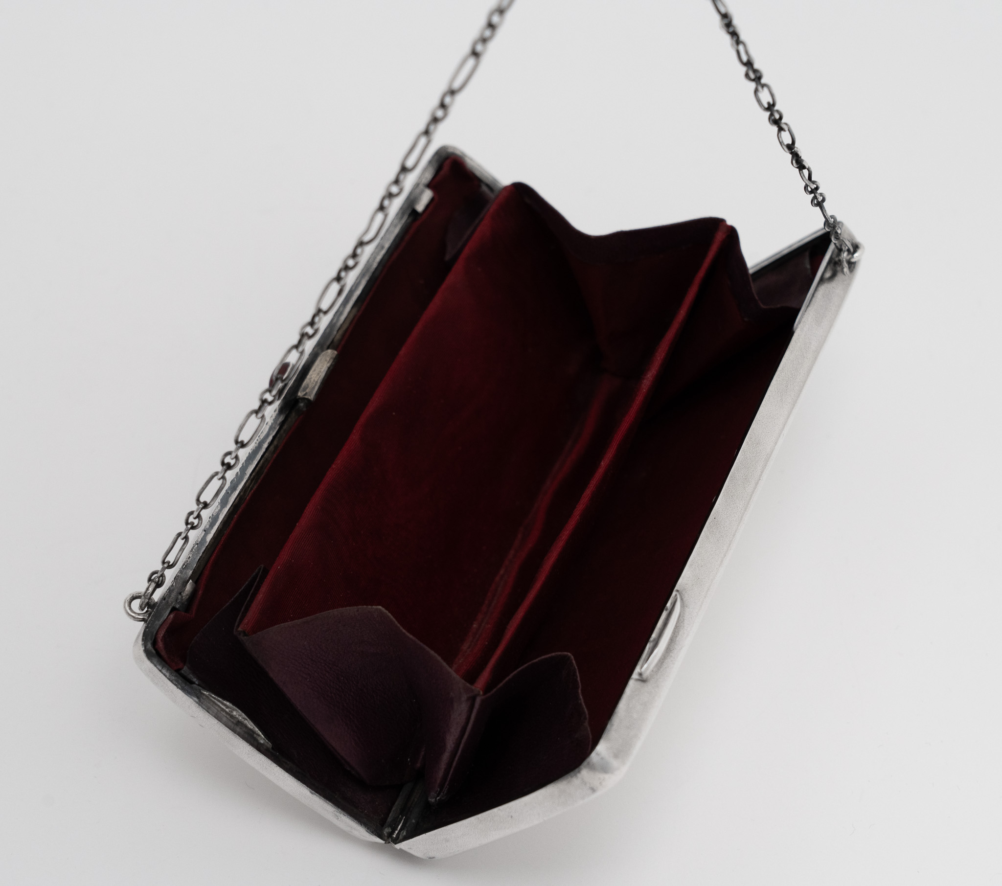 Elegante Moskauer Theater- oder Abendtasche aus 84er Silber (entspricht 875/1000 Silber). Die mattierte bzw. gefrostete Oberfläche ist mit feinen geometrisch-floralen Gravuren versehen, darunter fächerartige und geschwungene Linien sowie stilisierte Bordüren. Die Tasche ist mit einem weinroten Innenfutter ausgestattet, verfügt über mehrere Fächer und eine silberne Gliederkette als Henkel. Der frontseitige Verschluss ist mit einem roten Cabochon-Knopf versehen.