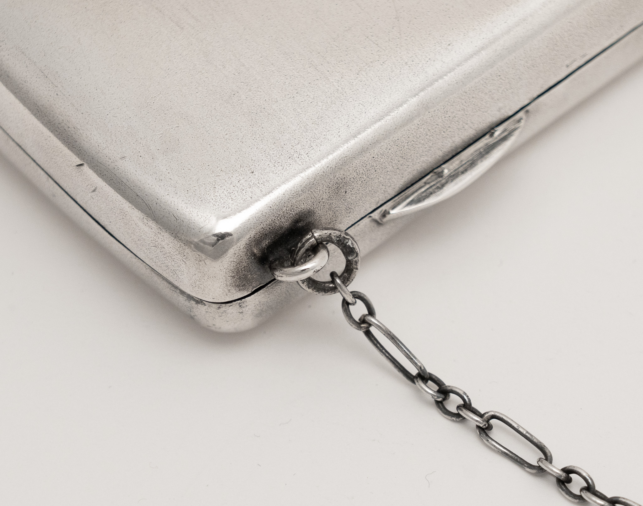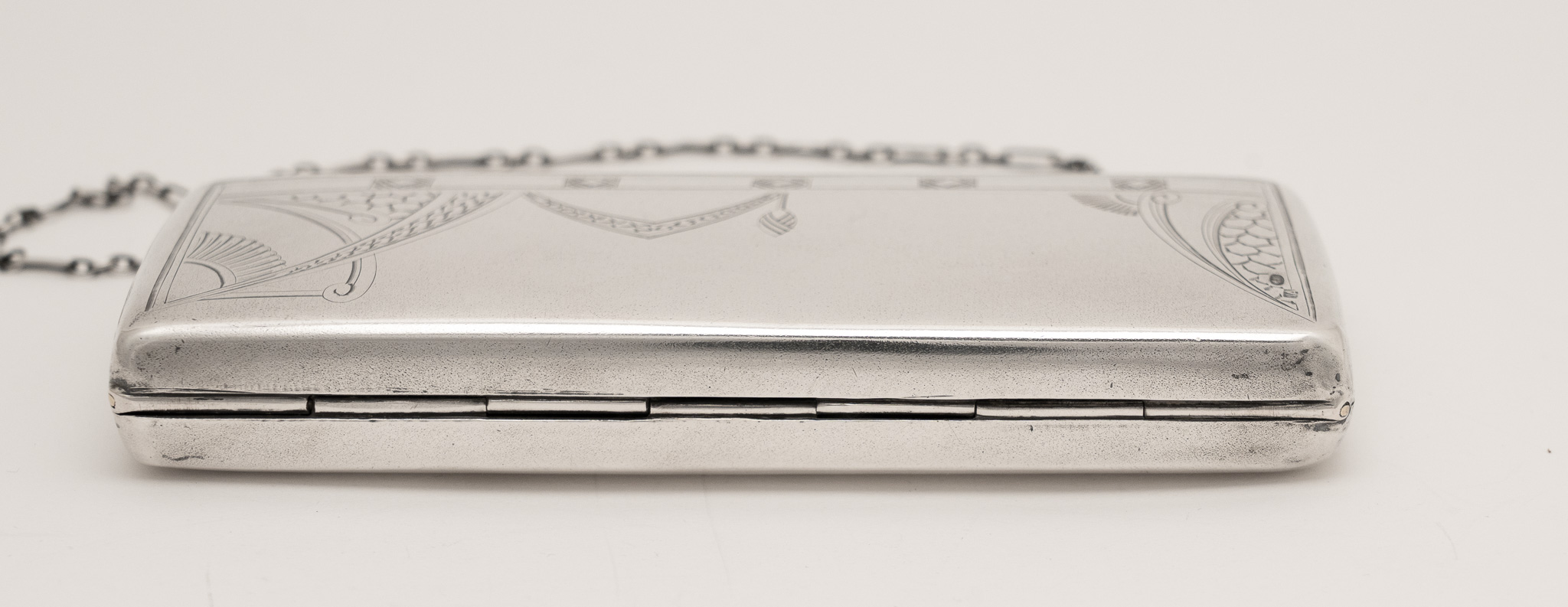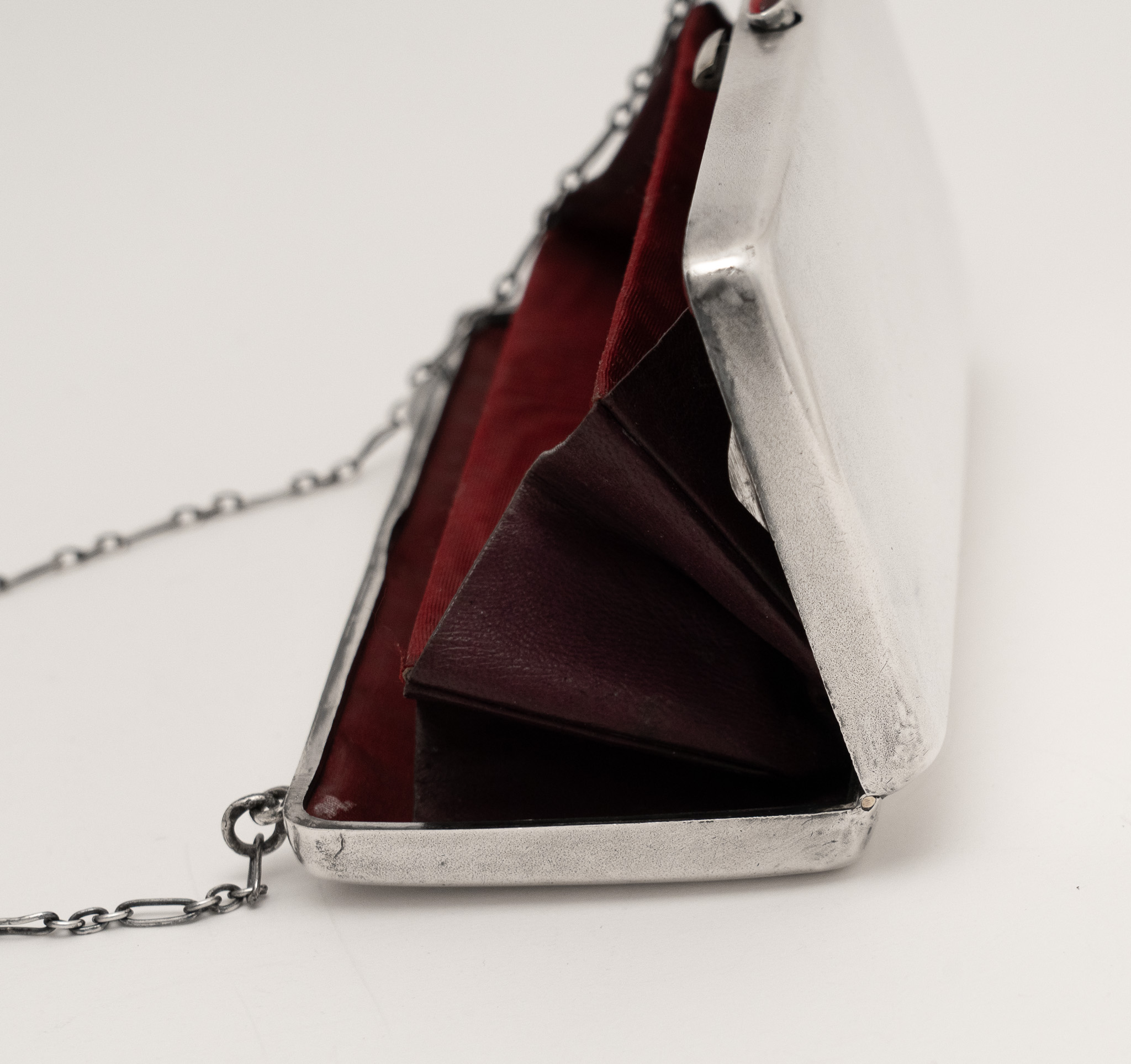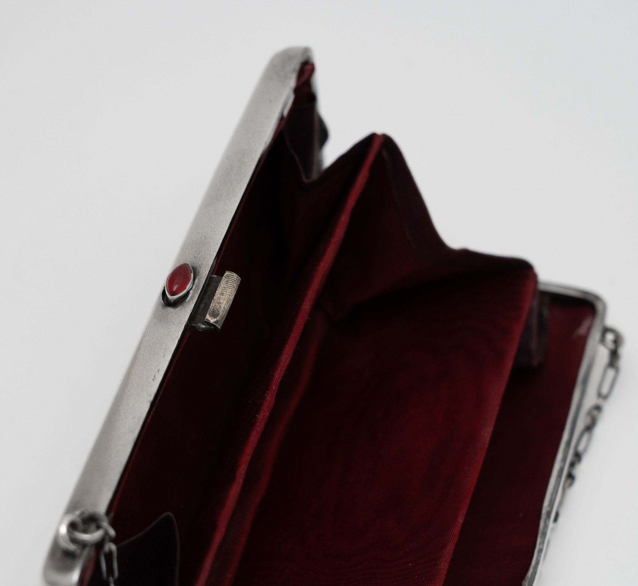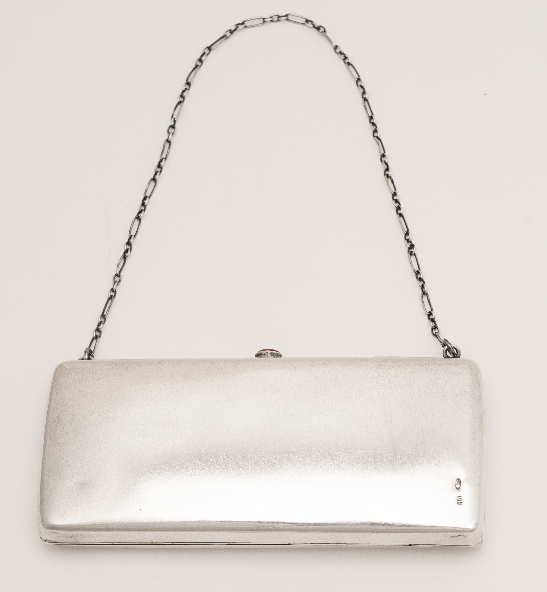 Elegante Moskauer Theater- oder Abendtasche aus 84er Silber (entspricht 875/1000 Silber). Die mattierte bzw. gefrostete Oberfläche ist mit feinen geometrisch-floralen Gravuren versehen, darunter fächerartige und geschwungene Linien sowie stilisierte Bordüren. Die Tasche ist mit einem weinroten Innenfutter ausgestattet, verfügt über mehrere Fächer und eine silberne Gliederkette als Henkel. Der frontseitige Verschluss ist mit einem roten Cabochon-Knopf versehen.