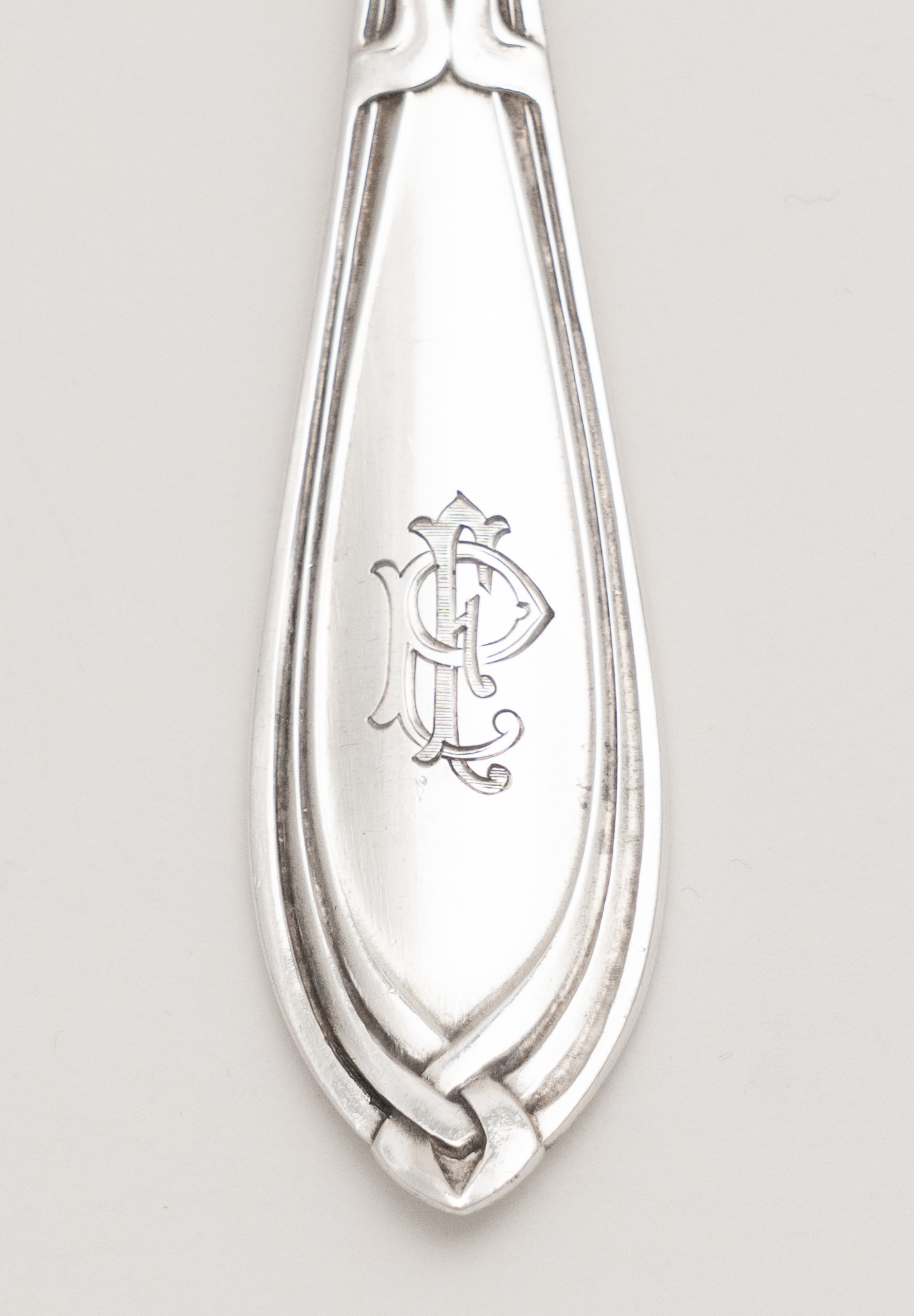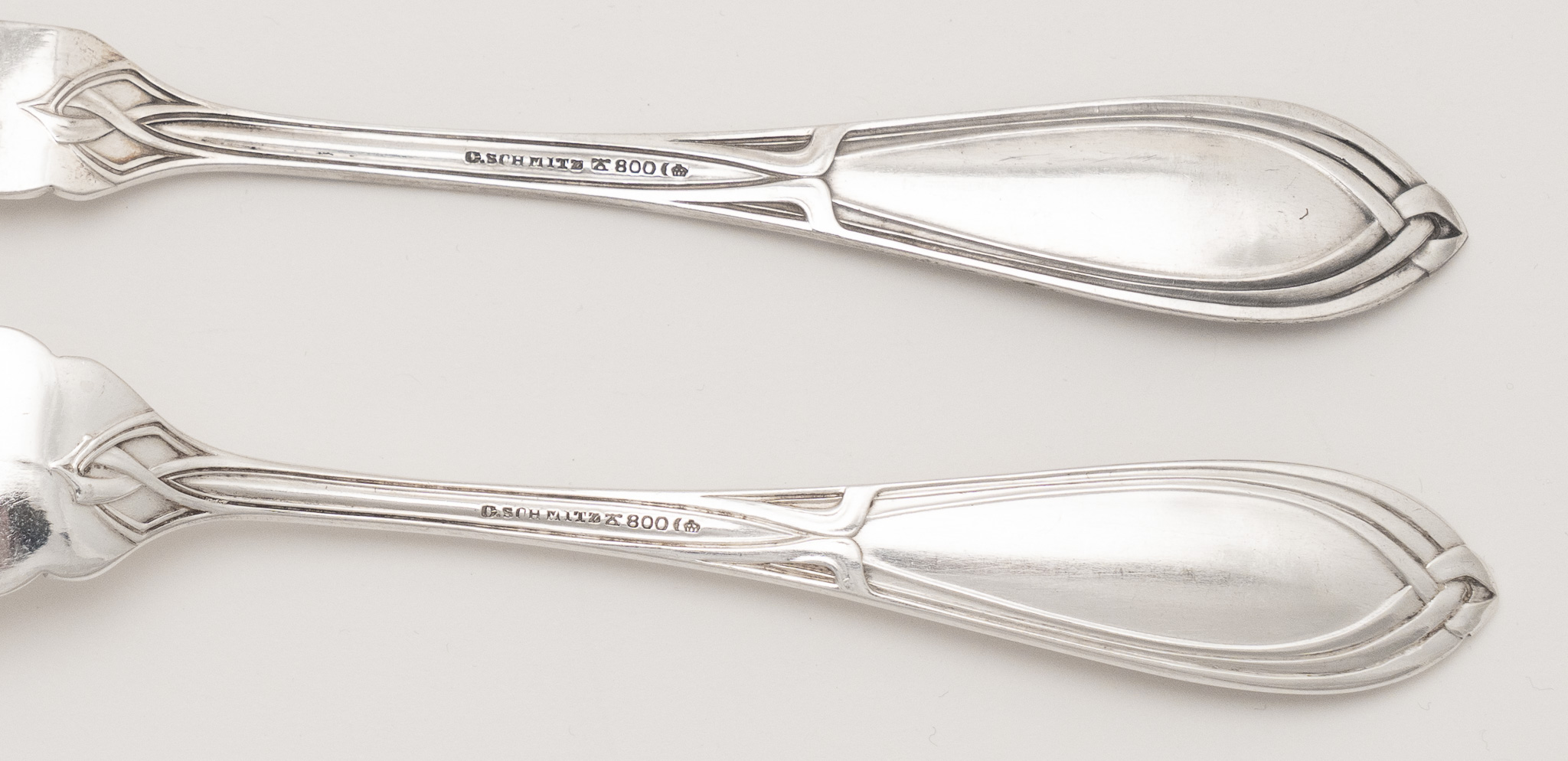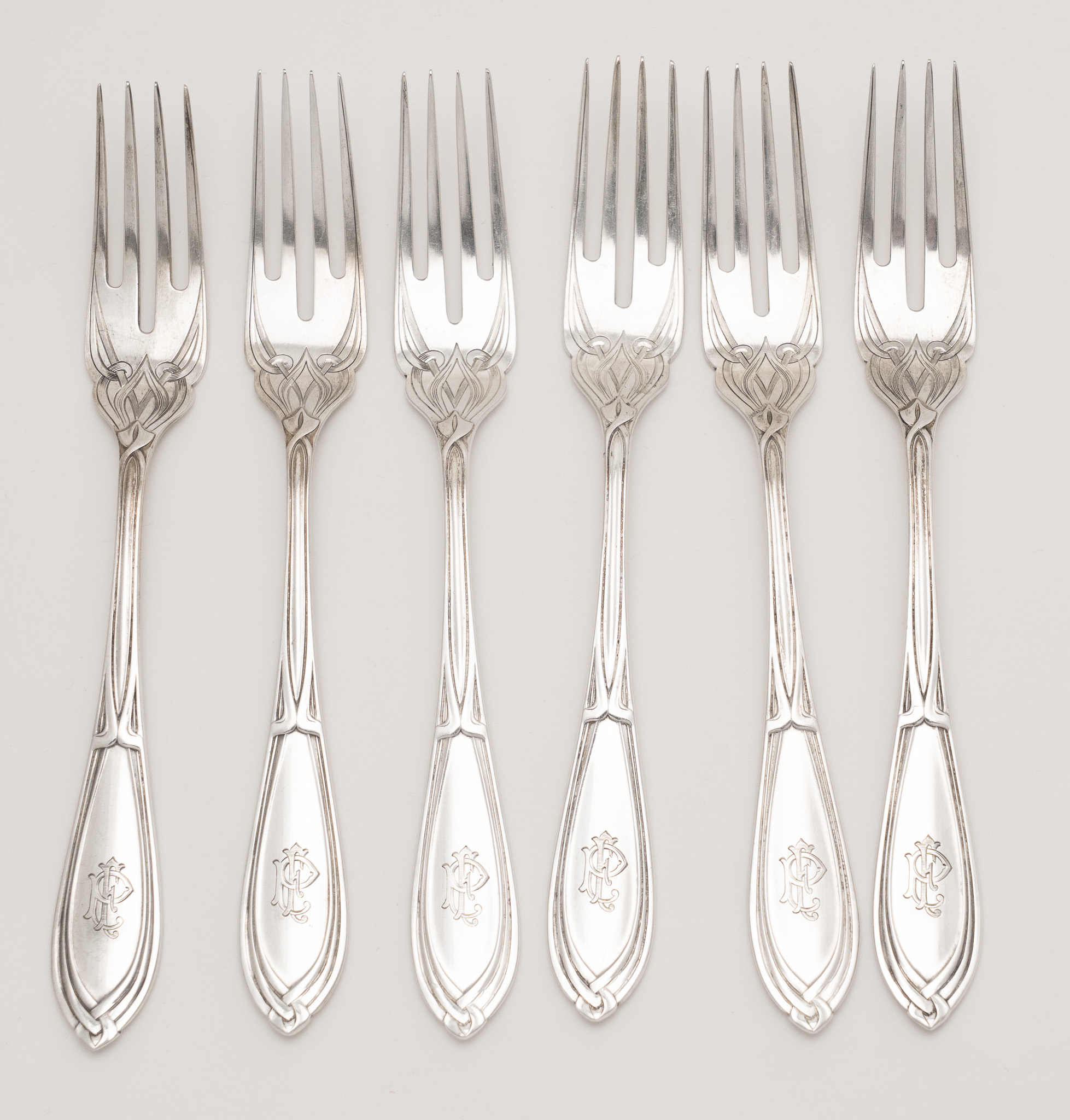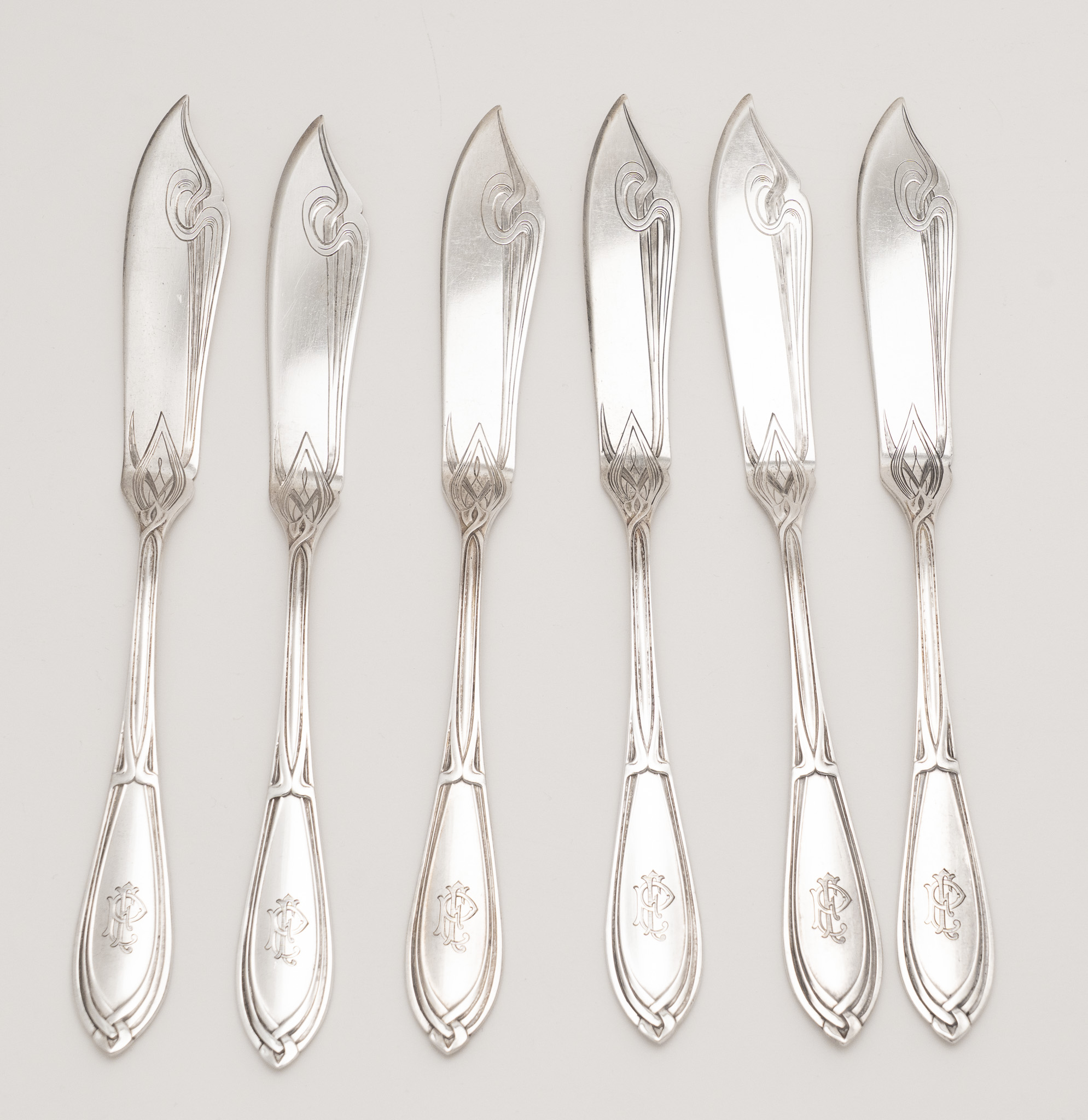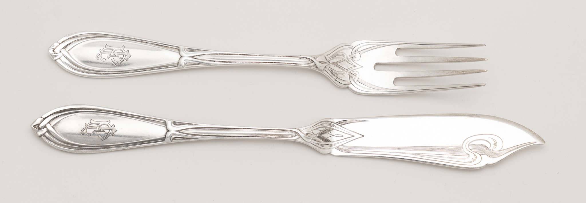 Das Bestecke in einem Jugendstil Entwurf mit einer fließende Formensprache und typischen Jugendstil Ornamenten. Schauseitig das zeitgenössische Monogramm FP.