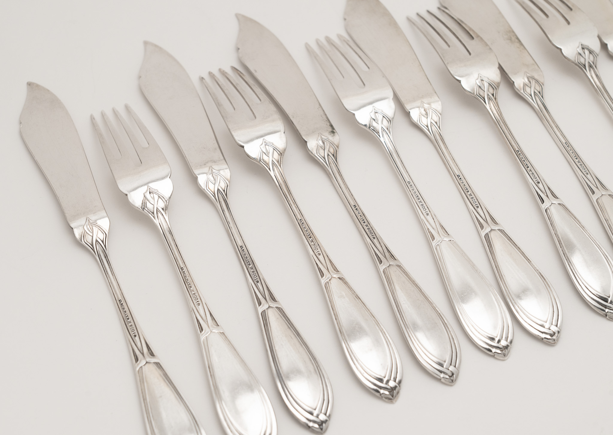 Ein 12-teiliges Jugendstil Fischbesteck in 800er Silber für sechs Personen - Wilkens 1. Drittel 20. Jahrhundert