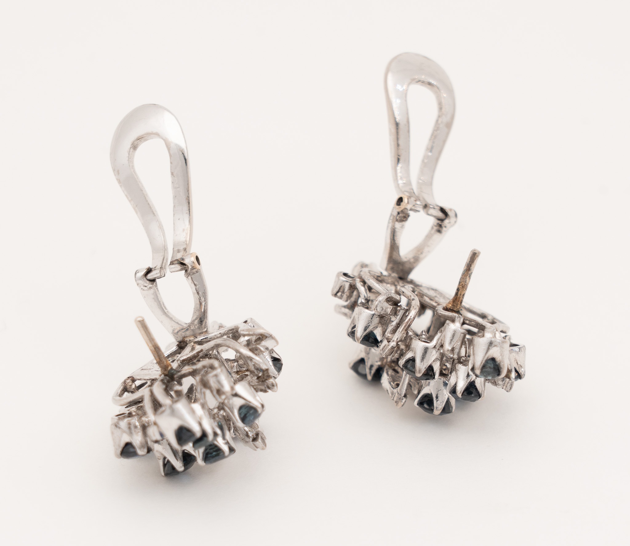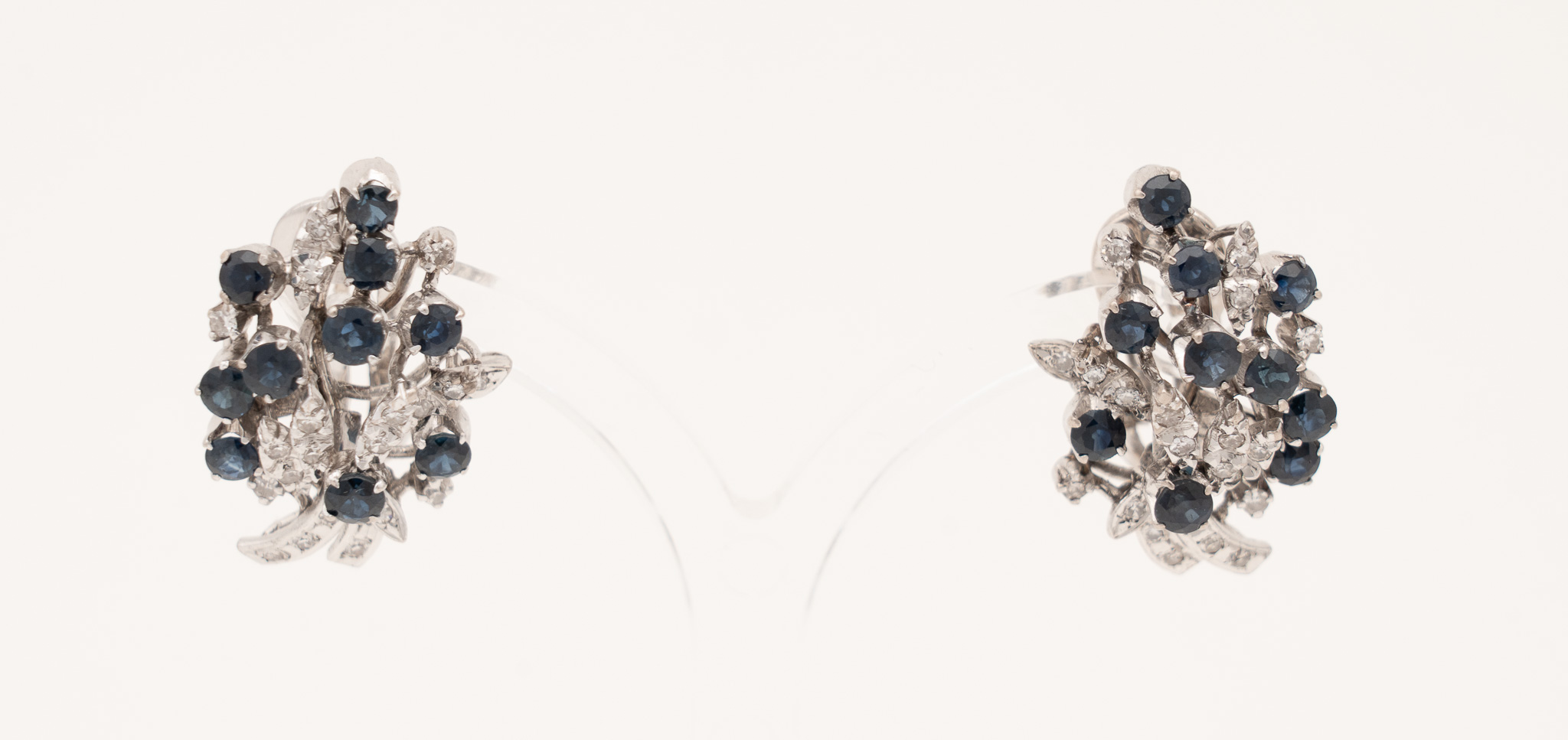 Ein Paar Ohrstecker in 18 Karat Weißgold (750/1000) mit zusammen 20 Saphiren von zusammen ca. 2,4 ct. und kleinen Diamanten. Um 1970.
