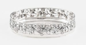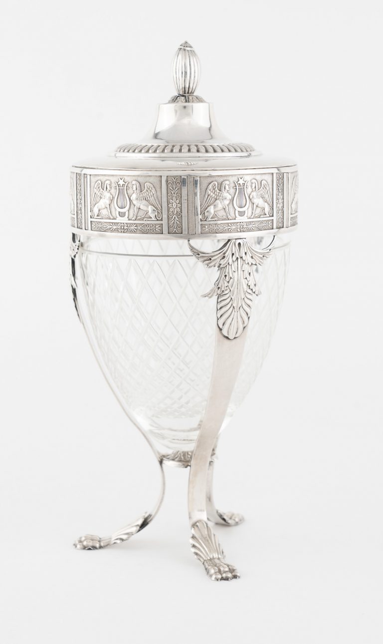 Eine feine Zuckerurne in mind. 800er Silber mit Einsatz aus geschliffenem Glas - um 1820 - VERKAUFT Ein Satz von 9 Messerbänkchen - gearbeitet in 800er Silber - Deutschland um 1900 Ein ovaler Flaschenuntersetzer für eine Bocksbeutelflasche in 800er Silber - VERKAUFT Eine französische Weinkaraffe in Bocksbeutelform mit Silbermontierung in 950er Silber - Frankreich 1. Hälfte 20. Jhdt Ein Paar Kampfhähne gearbeitet in 925er Sterling Silber - Neresheimer Hanau Eine solide Sauciere in 833er Silber - Dänemark 1942 Ein Paar solide George III. Cloches in 925er Silber - Marquess of Londonderry - London um 1800 Ein Satz von vier Buchbeschlägen in Silber aus der Zeit des Rokoko