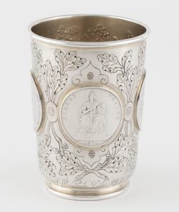Ein außergewöhnlicher Silberbecher in 925 Sterlingsilber mit eingearbeiteten Medallions - deutsch modern Ein sehr solider Silberbecher mit 4 Siegesthalern von 1871 und einem Thaler von 1860 - VERKAUFT Ein fein guillochierter Moskauer Silberbecher - gearbeitet in 84er Silber - Moskau 1870