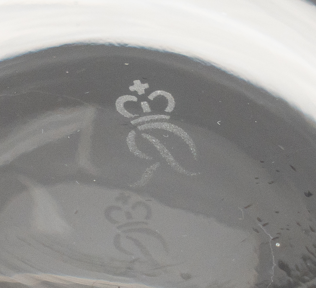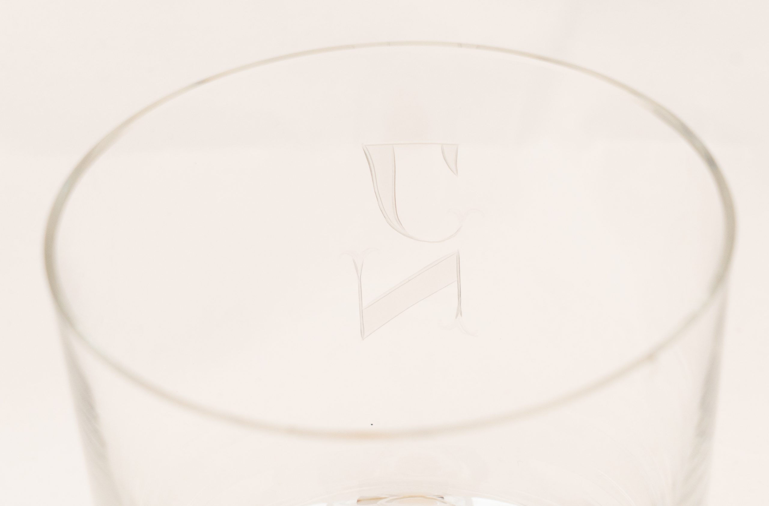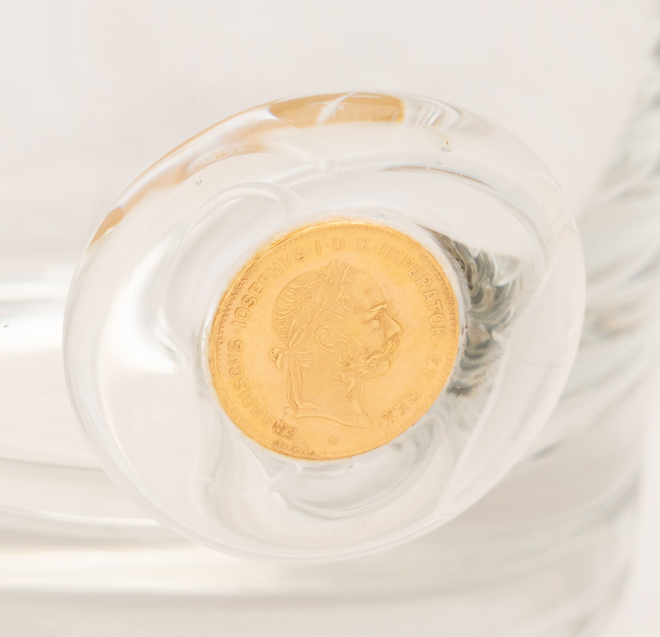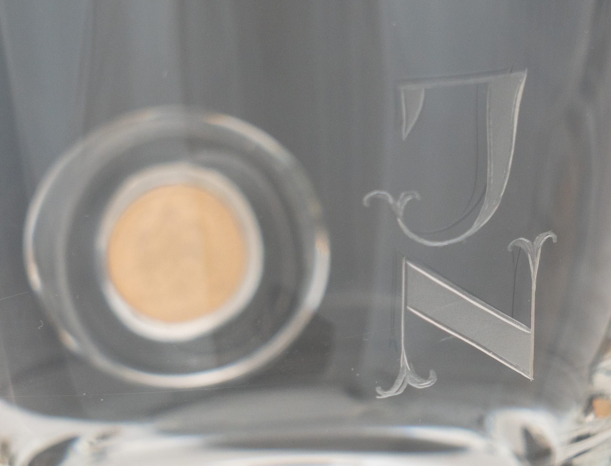 Farbloses Glas mit aufgesetzter Goldmünze und Monogramm J.N.